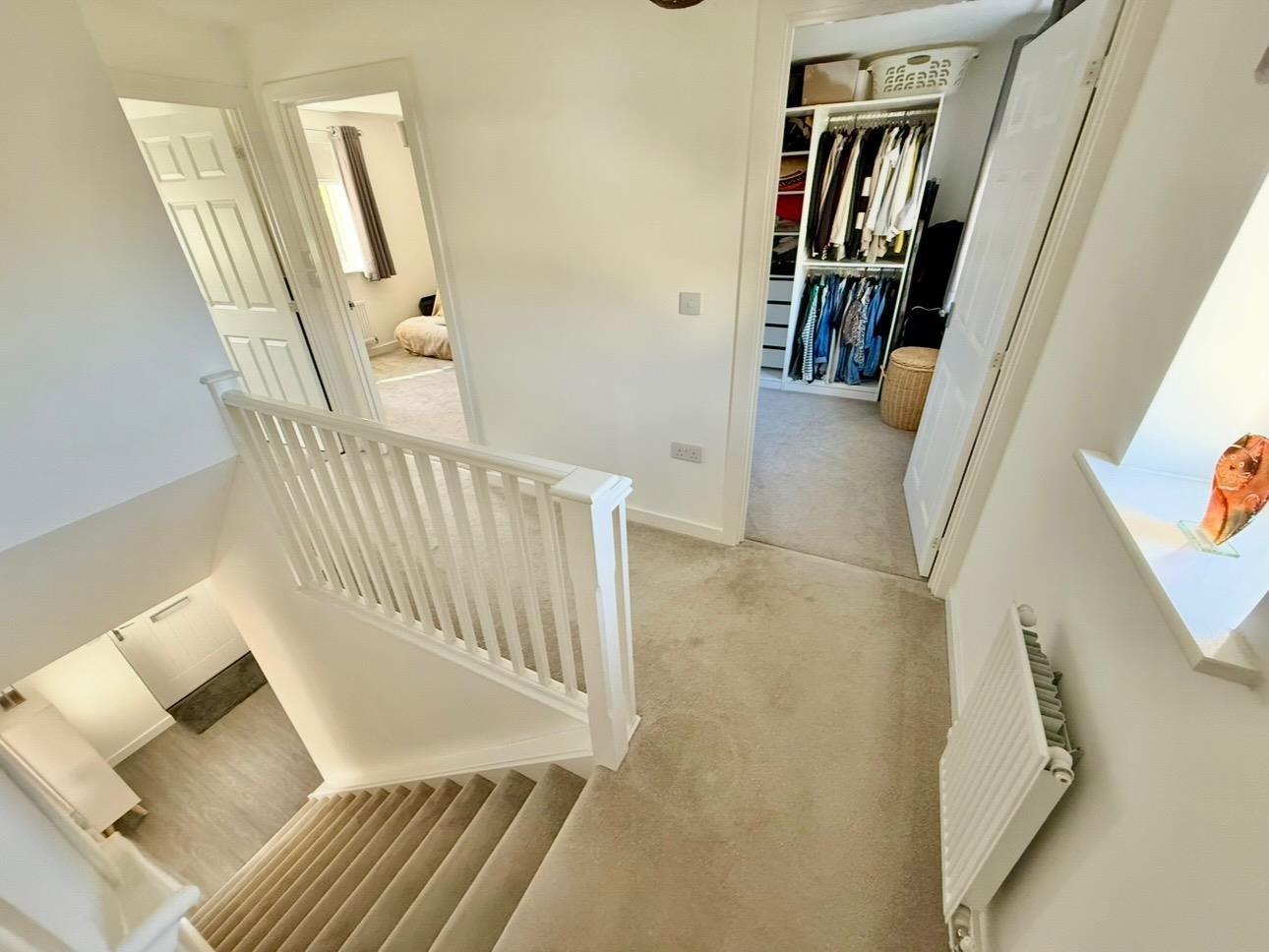 Providing access to the first floor accommodation. Loft hatch. Over-stairs cupboard with shelving. Window to the rear elevation.