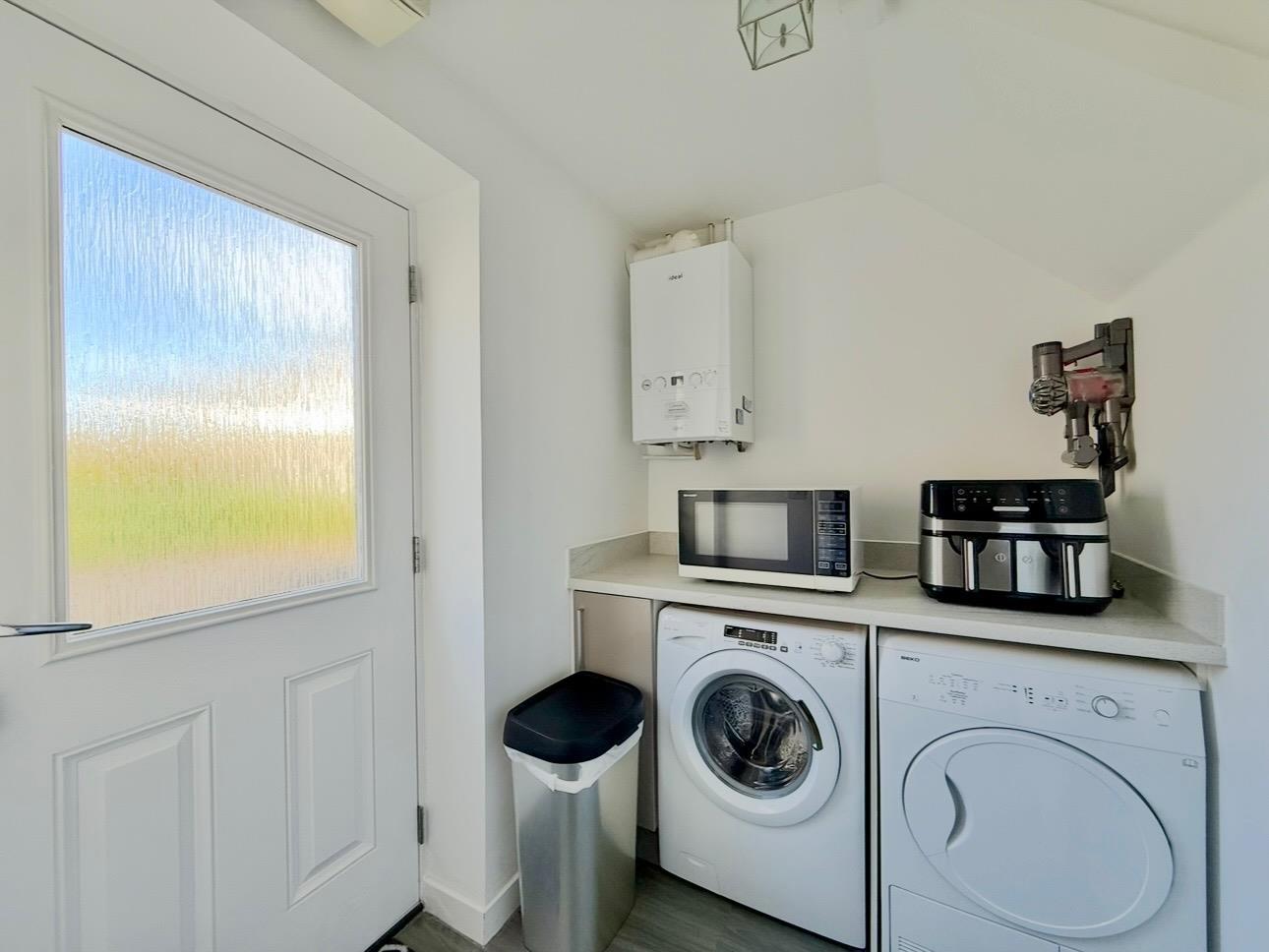 Matching work surface and cabinet. Space for washing machine and tumble dryer. Wall-mounted gas boiler. Partly-glazed door leading to the rear garden. Doorway opening into the downstairs cloakroom/wc.