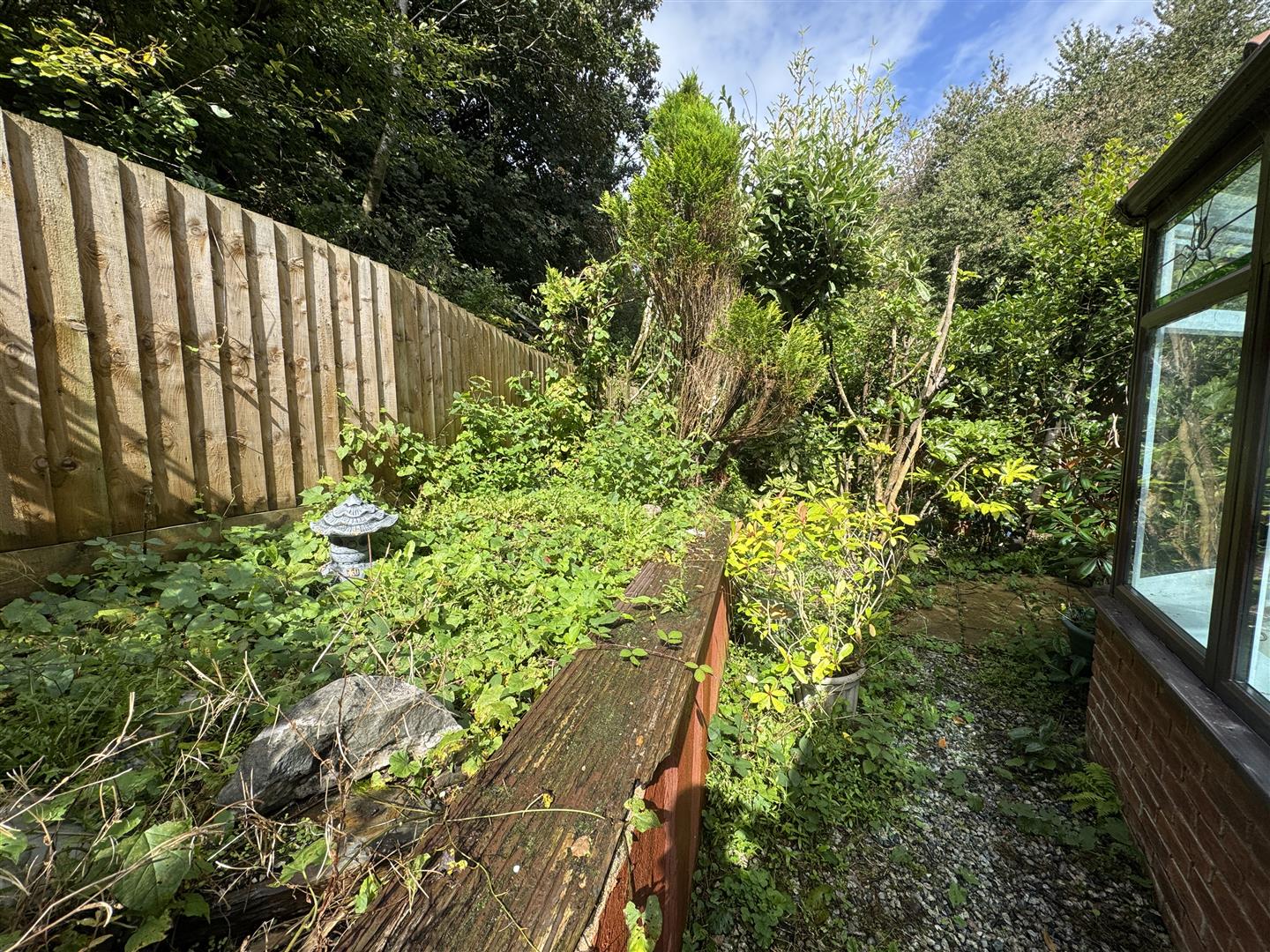 To the rear an enclosed garden consisting of a paved patio seating area & large raised flower shrub border. To the rear the path runs around the side of the conservatory where a wooden garden shed stands.
