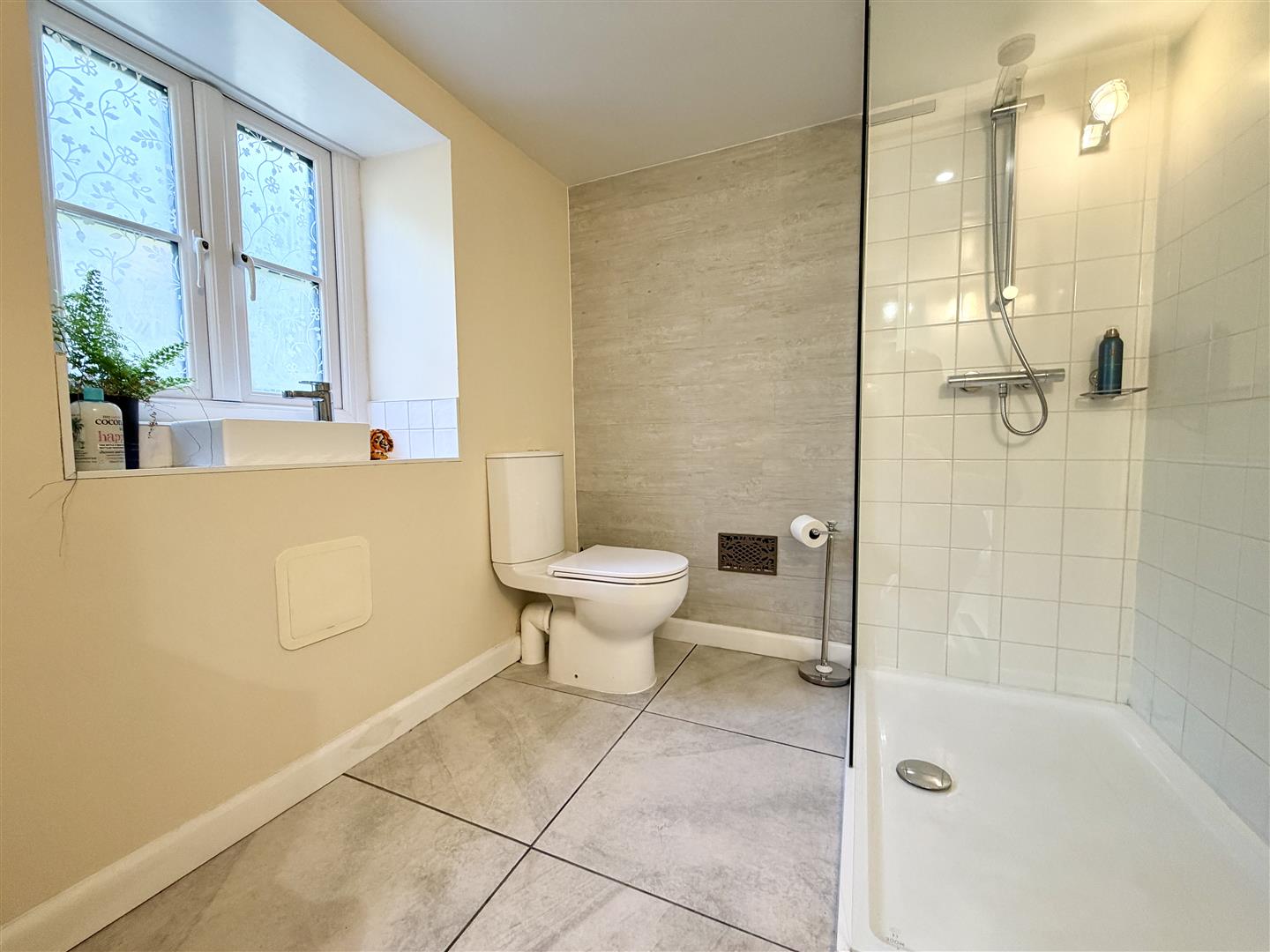 Matching suite comprising a walk-in double thermostat shower, close coupled wc and hand wash basin with a mixer tap over and set onto the tiled window ledge. uPVC double-glazed patterned glass window to the rear elevation.
