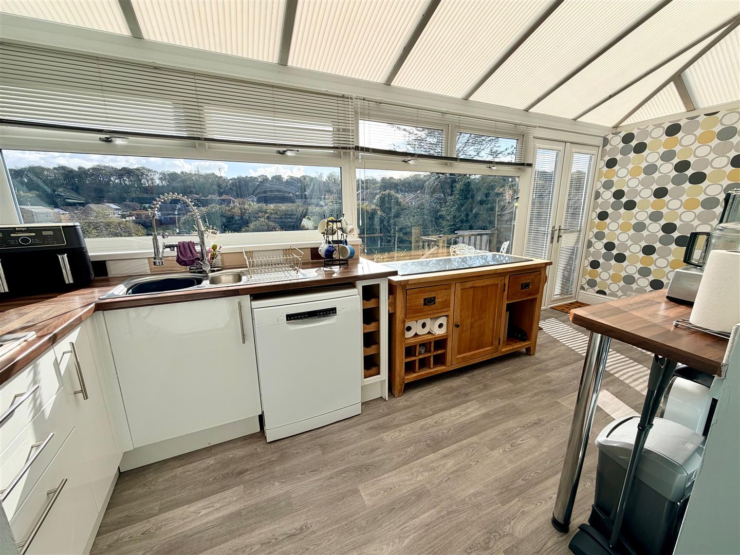 Running the full-width of the property with ample space for table and chairs. Range of fitted cabinets with matching work surfaces and splash-backs. Breakfast bar. Inset one-&-a-half bowl single drainer sink unit. Inset stainless-steel 4-burner gas hob with a cooker hood above. Built-in double oven and grill. Built-in wine rack. Space and plumbing for dishwasher. Space for an American-style fridge-freezer. 2 windows with fitted blinds to the rear elevation providing lovely views over the garden towards the surrounding area and Dartmoor and the South Hams countryside in the distance. French doors with fitted blinds to the rear opening onto the balcony.