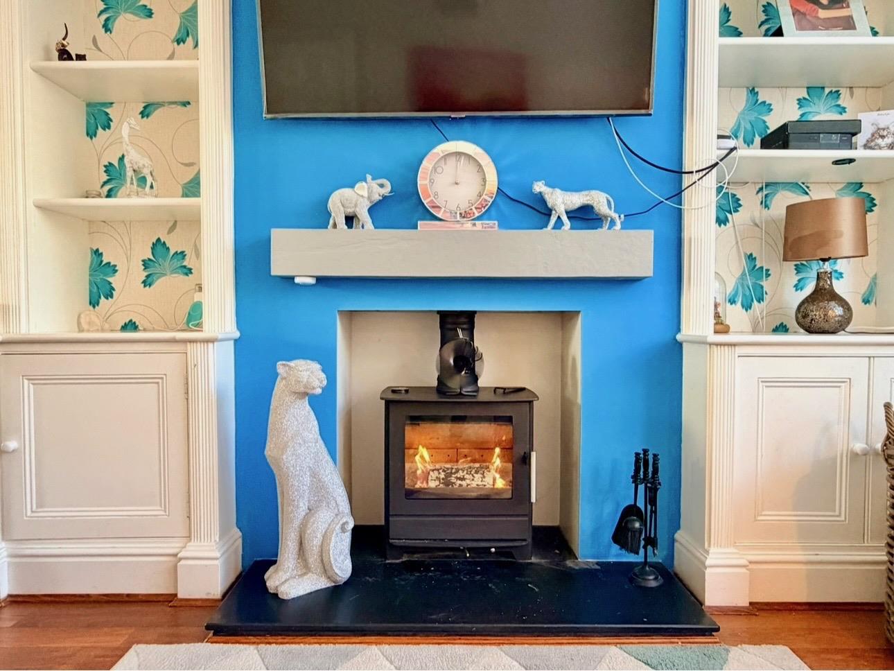 A lovely open-plan room with fitted flooring throughout. Bay window with a window seat to the front elevation. Chimney breast with wood burner with storage and shelving either side. Second chimney breast with an attractive arched recess, which is currently used as a log store. Partly-glazed double doors opening into the kitchen/dining room.