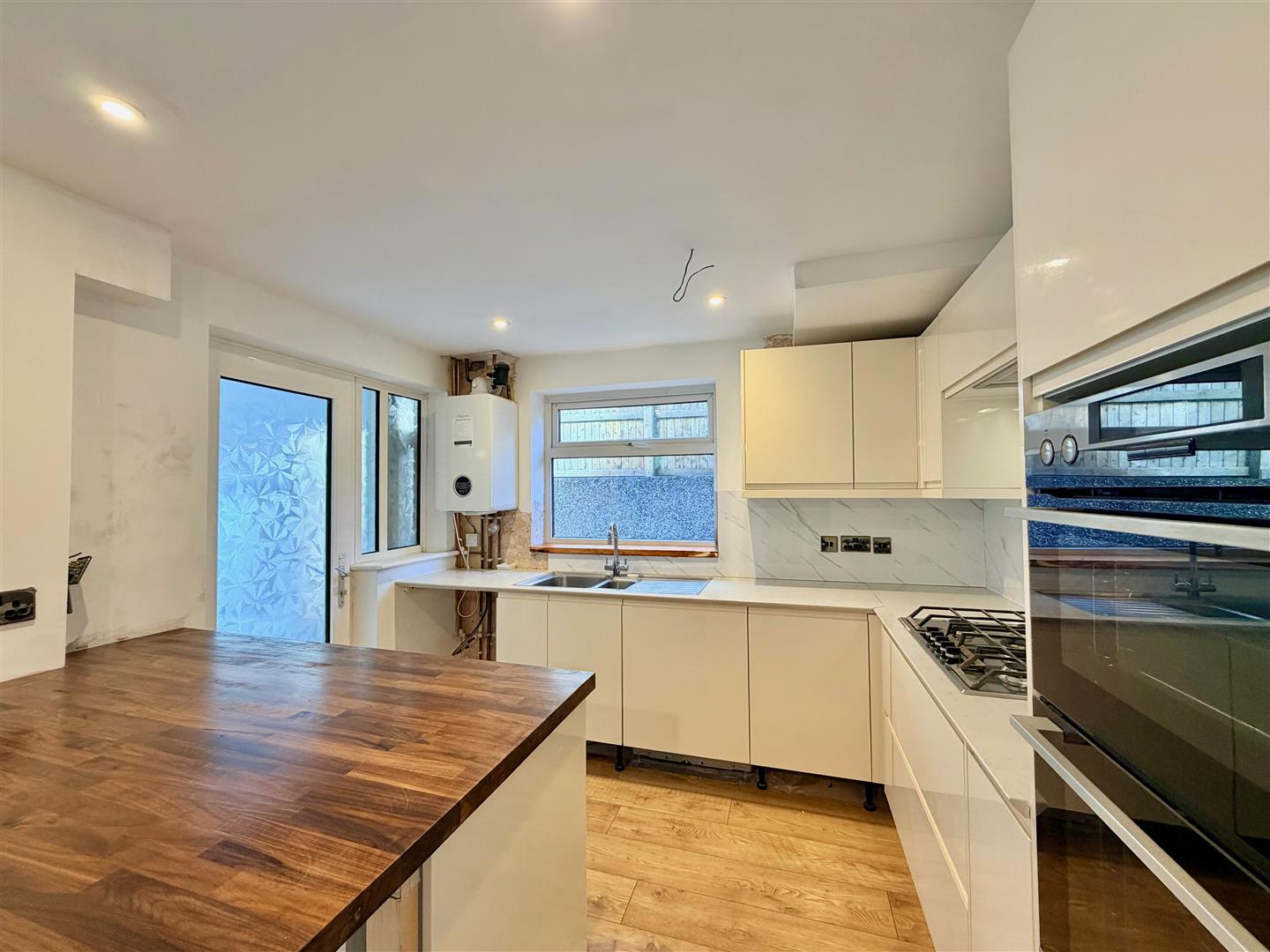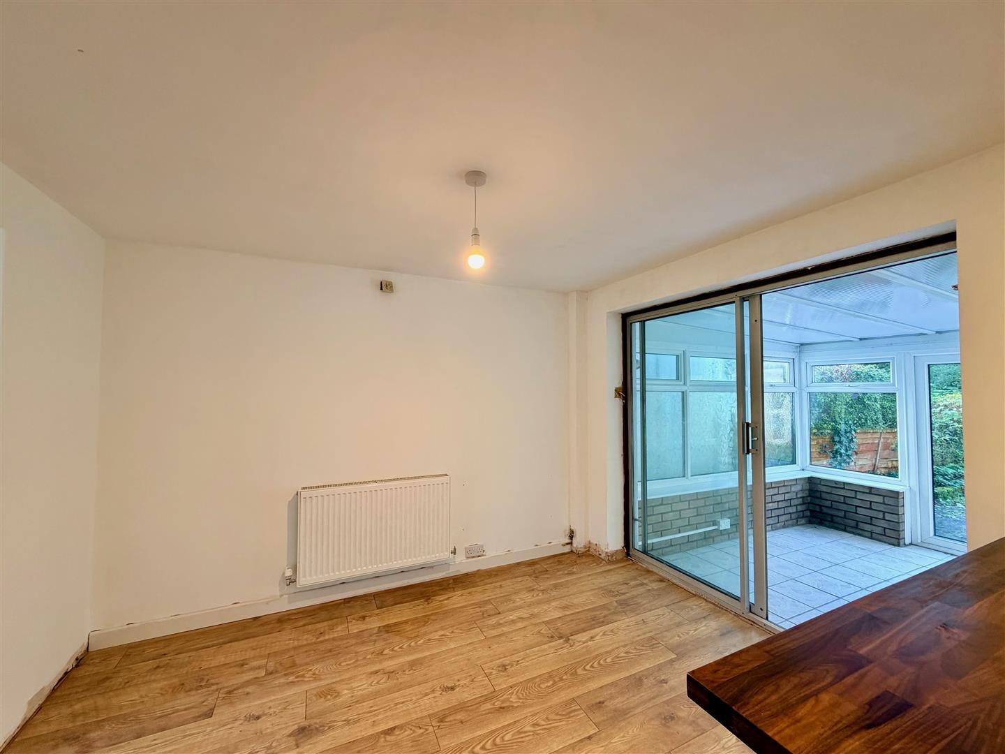 Ample space for dining table and chairs. Range of base and wall-mounted kitchen cabinets with matching work surfaces and splash-backs. Stainless-steel one-&-a-half bowl single drainer sink. Inset 5-burner gas hob with a cooker hood above. Built-in double oven and grill. Integrated fridge and freezer. Integral dishwasher. Space and plumbing for washing machine. Wall-mounted gas boiler. Hard wired smoke detectors. Window to the side elevation. Additional door leading from the kitchen area into the conservatory.