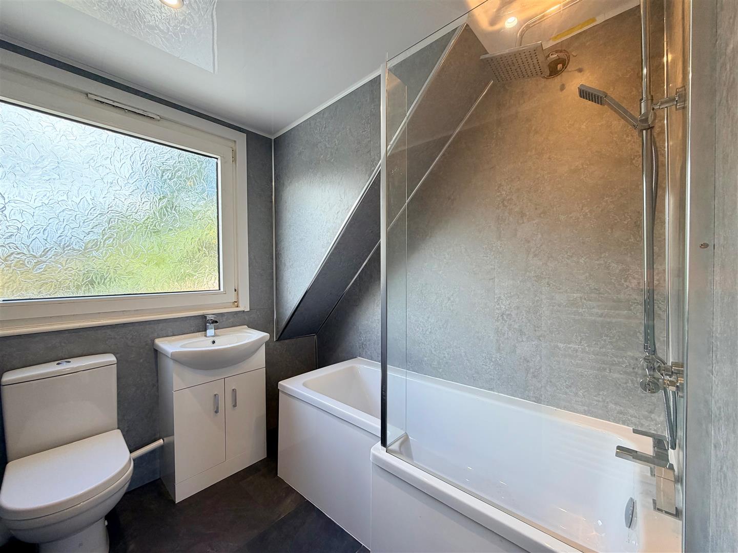 Comprising a bath with a shower system over and a glass screen, basin with a cupboard beneath and wc. Towel rail/radiator. Waterproof panelling to the walls. Obscured window to the rear elevation.