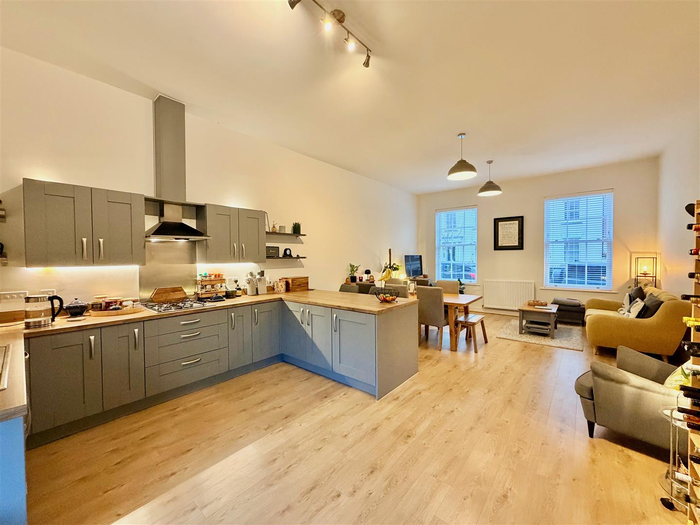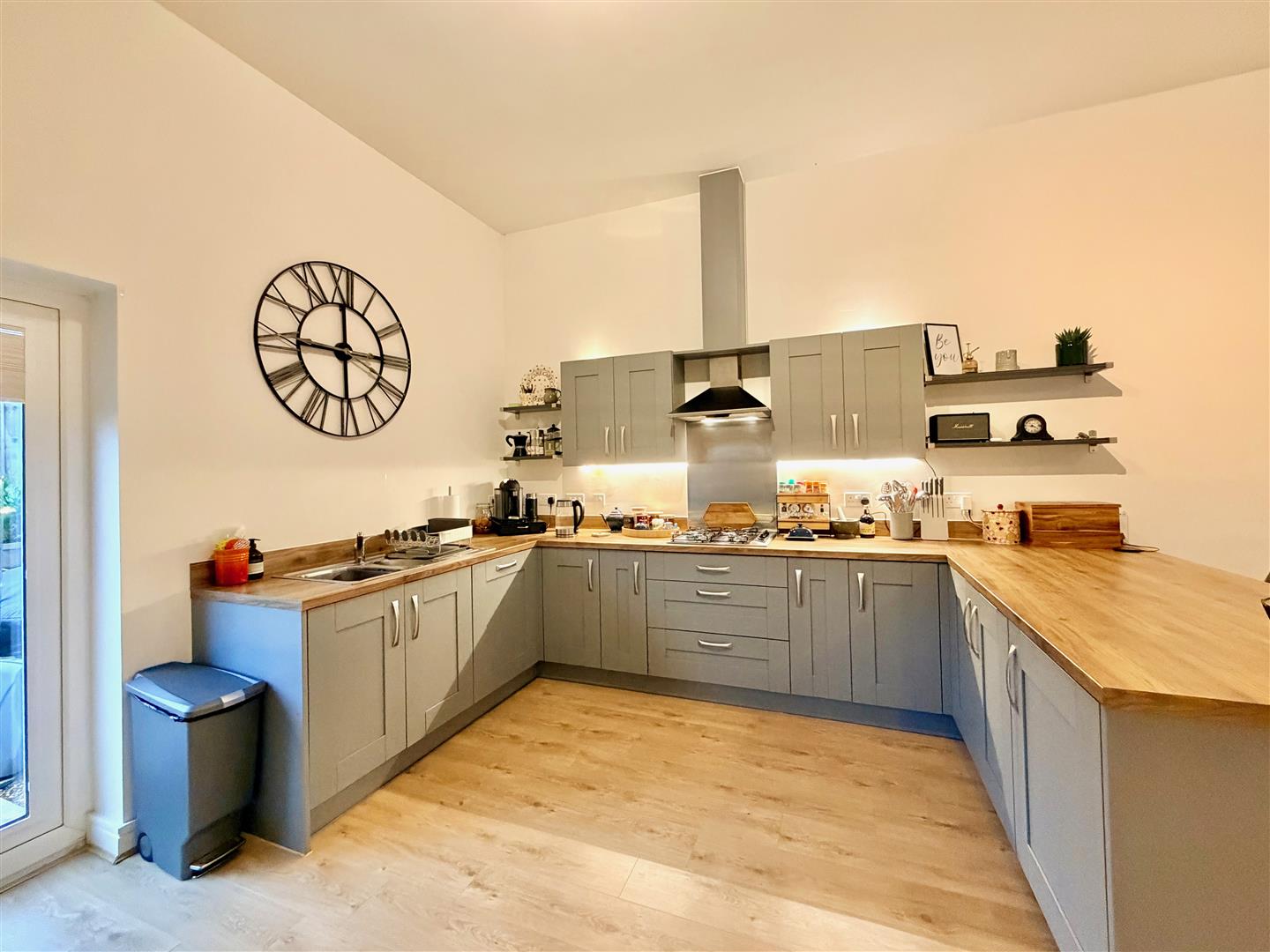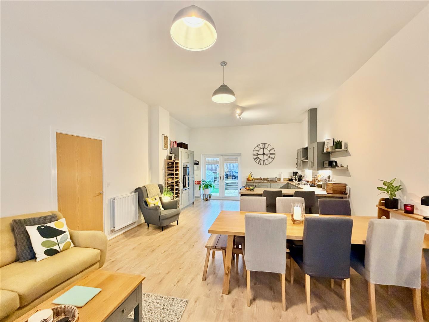 A superb feature ground floor room running from front to rear with feature high ceilings. 2 windows to the front elevation and French doors to the rear. Ample space for seating and dining. Kitchen cabinets with matching fascias and work surfaces. Breakfast bar. Stainless-steel one-&-a-half bowl single drainer sink unit. Built-in double oven and grill. Stainless-steel 4-burner gas hob with a stainless-steel splash-back and cooker hood. Integral fridge and freezer. Integral dishwasher.