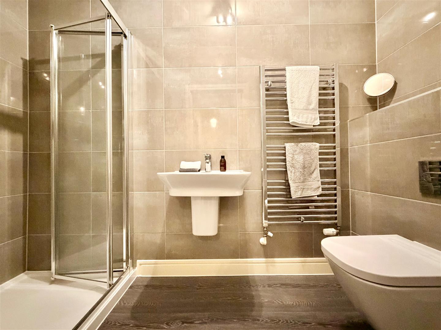 Comprising a shower, wall-mounted basin and wc with a concealed cistern and a push-button flush. Chrome towel rail/radiator. Fully-tiled walls. Obscured window to the rear elevation.