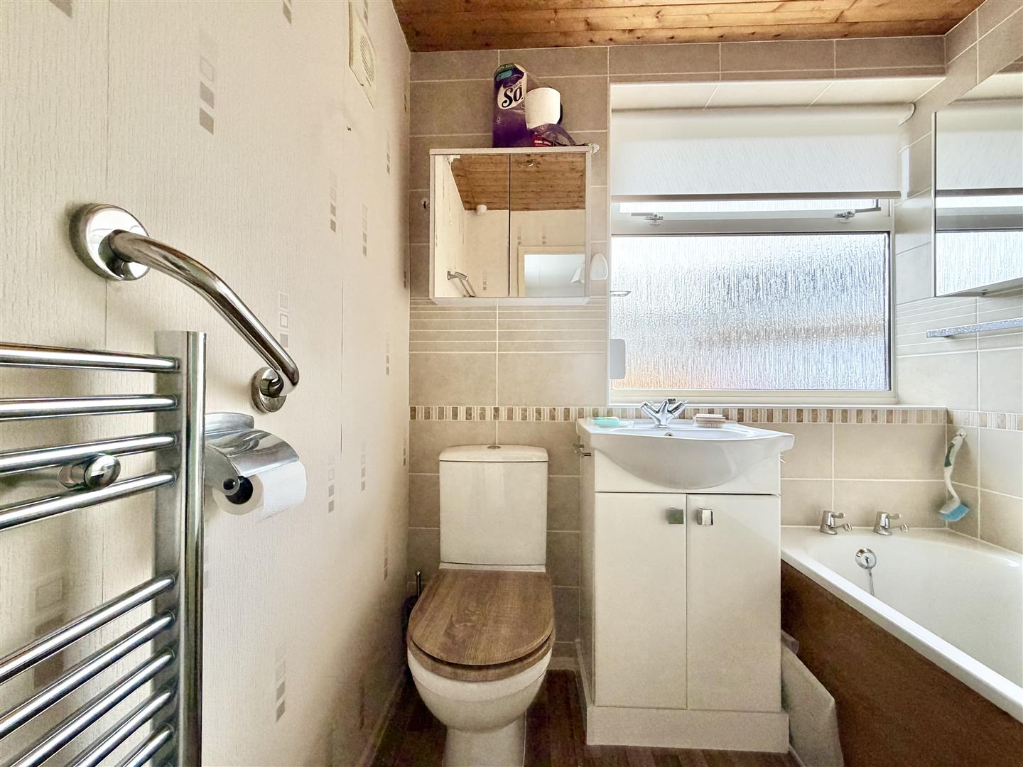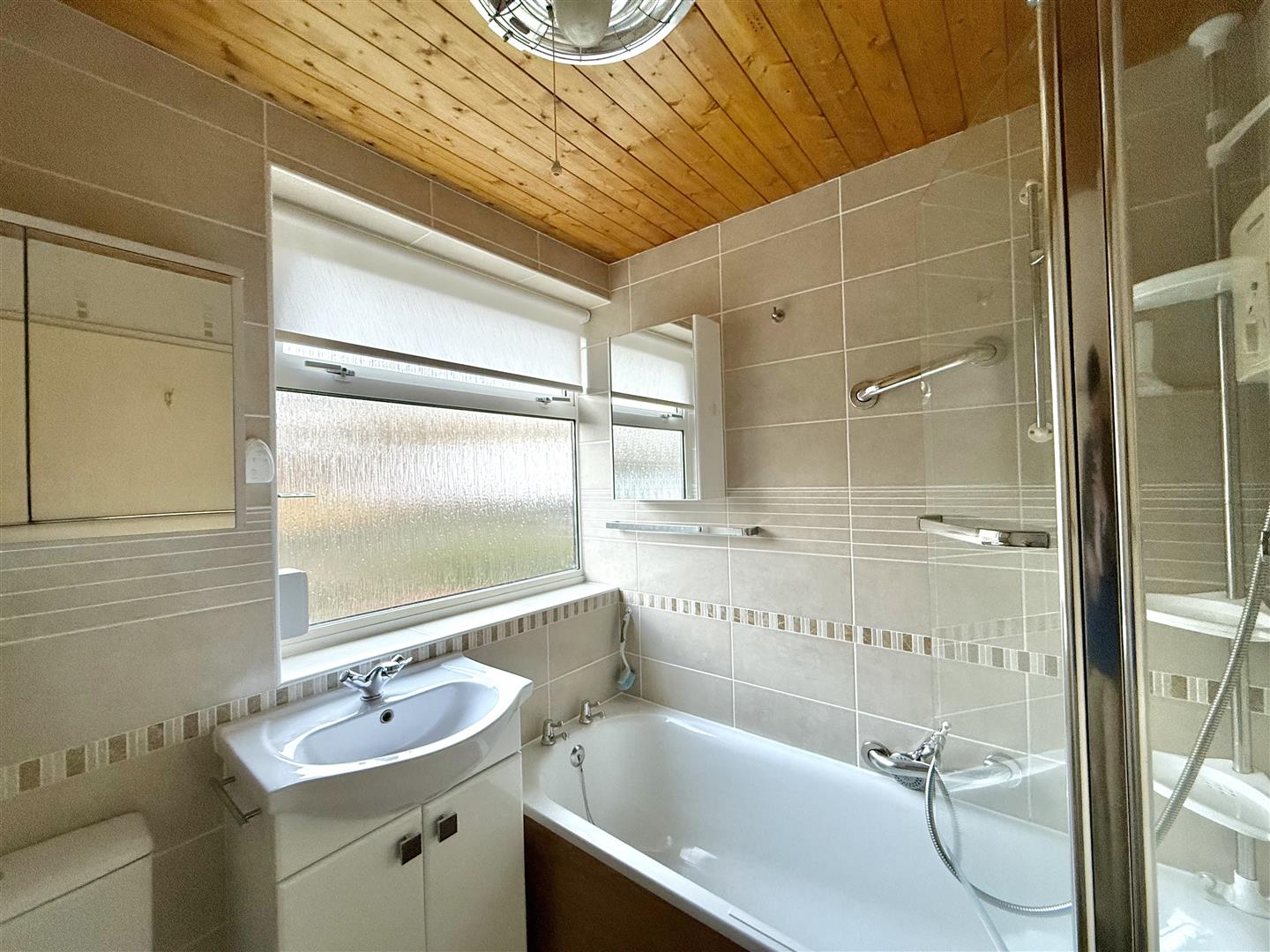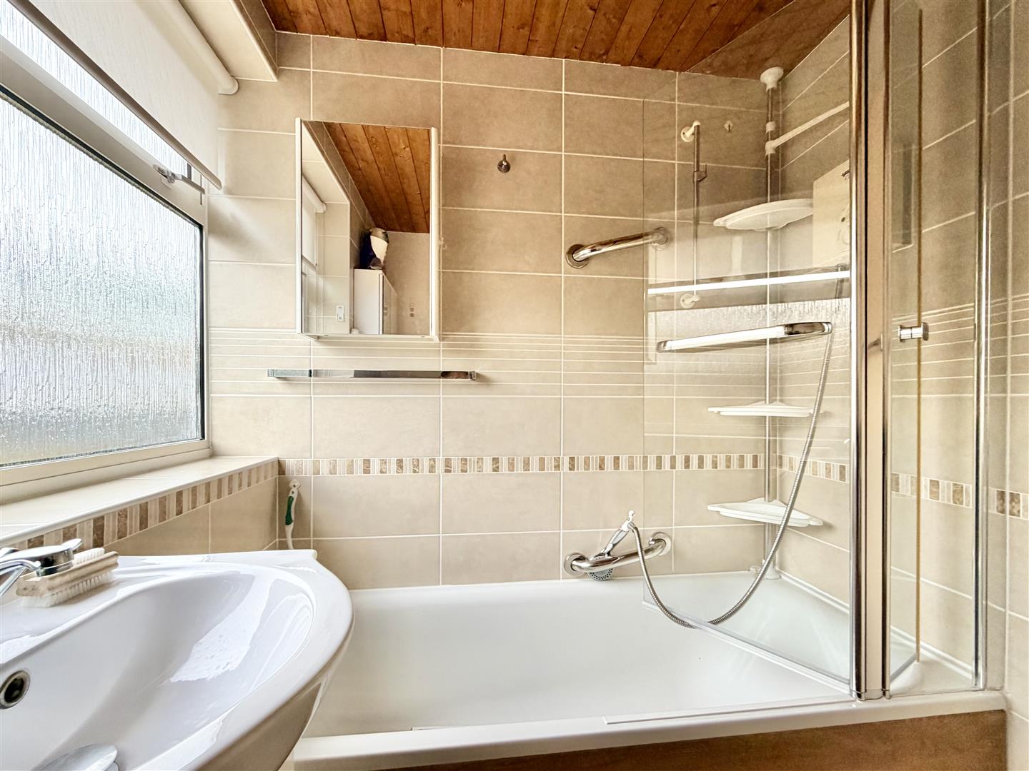 Comprising a bath with a shower system over and a glass screen, wc and basin with storage beneath. 2 mirrored cabinets. Chrome towel rail/radiator. Partly-tiled walls. Obscured window to the rear elevation.