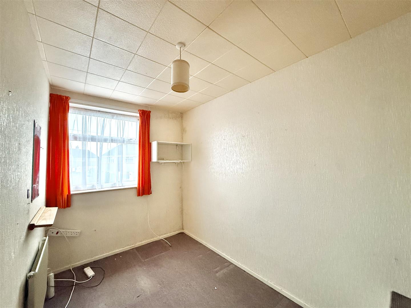 Window to the front elevation. Storage cupboard with slatted shelving and housing the gas boiler.