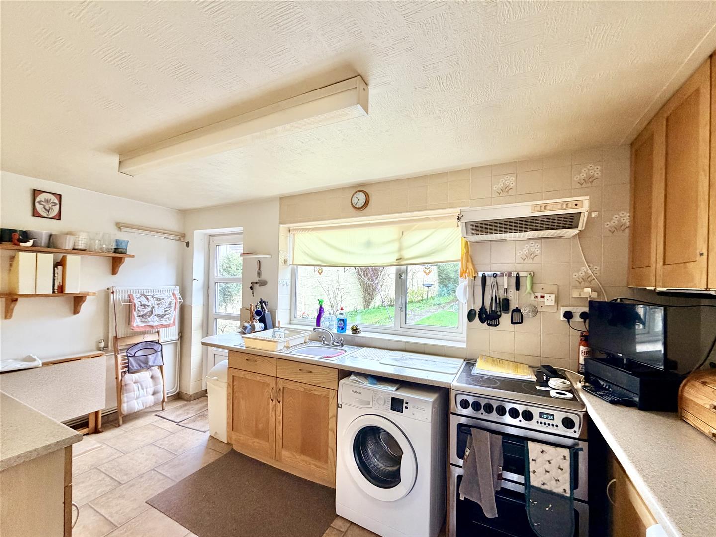 Range of base and wall-mounted cabinets with matching fascias and work surfaces. Partly-tiled walls. Stainless-steel single drainer sink unit. Space and plumbing for a washing machine. Space for fridge and freezer. Space for free-standing cooker. Under-stairs storage cupboard. Window to the rear elevation overlooking the garden. Door leading to outside.