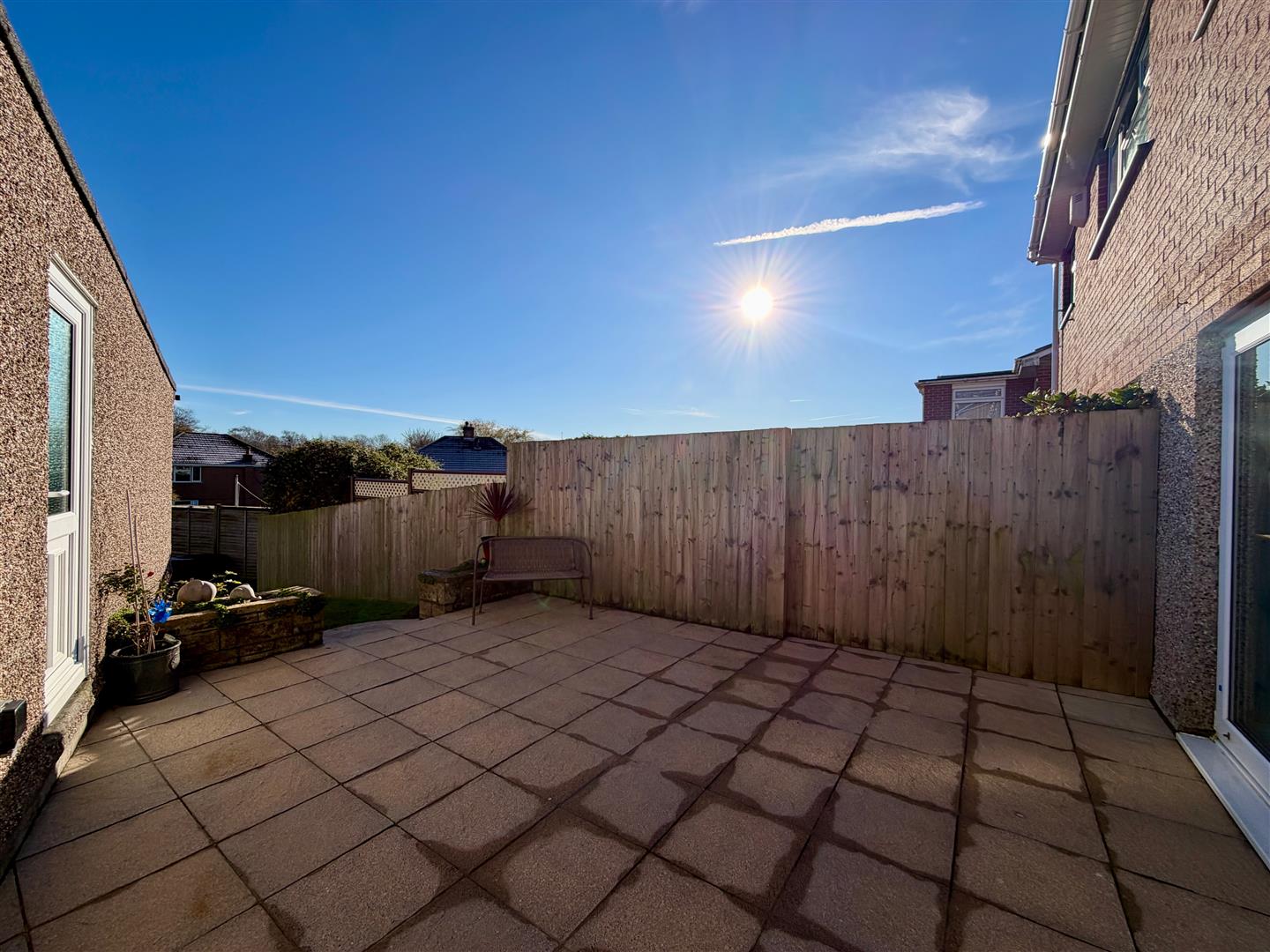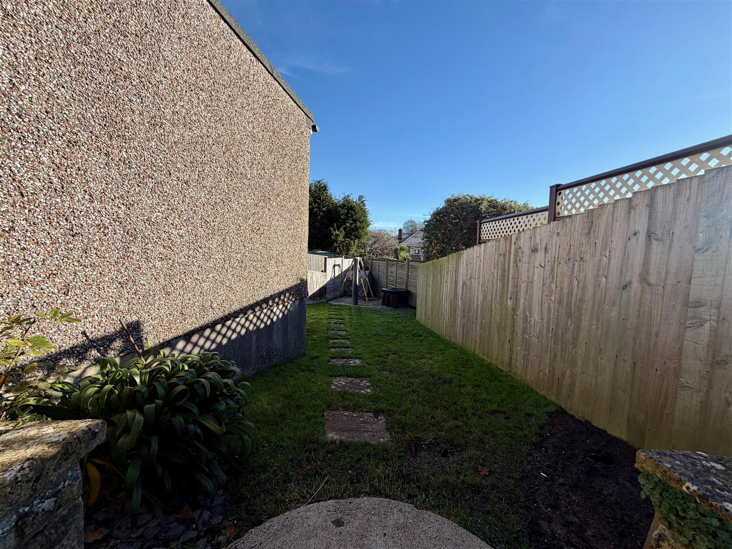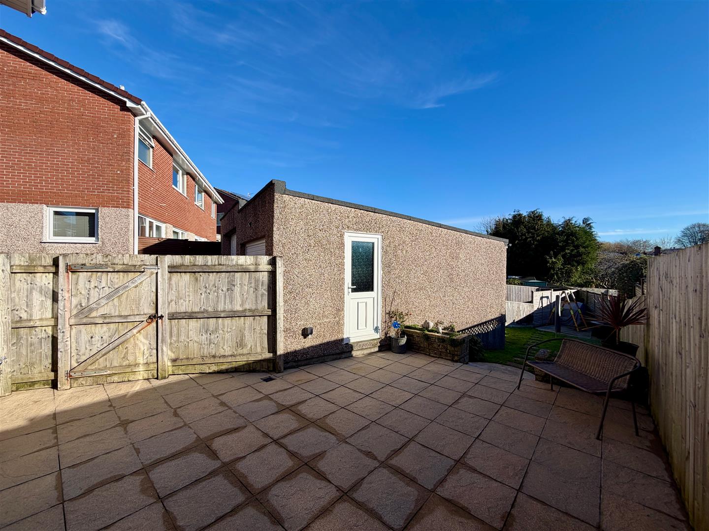 The property is approached via a slabbed walkway bordered by an area of lawn, a raised planter with mature shrubs and slate chippings. A driveway runs alongside through to the garage. A wooden gate provides access to the fully-enclosed rear garden which incorporates paved patio areas leading and an area laid to lawn. Outside power. Outside tap.
