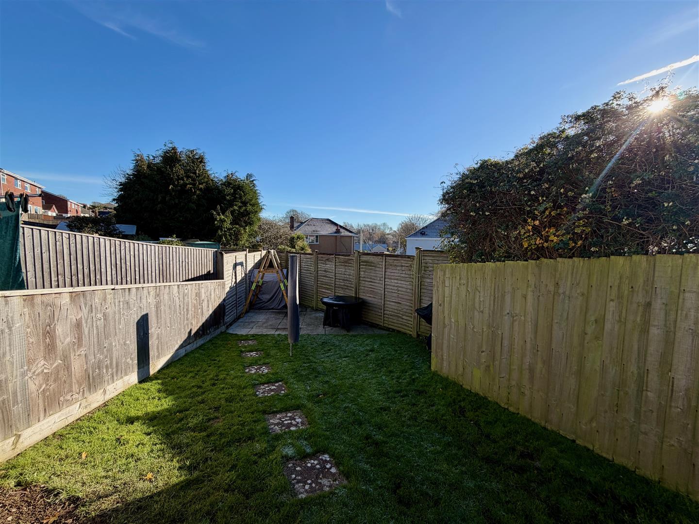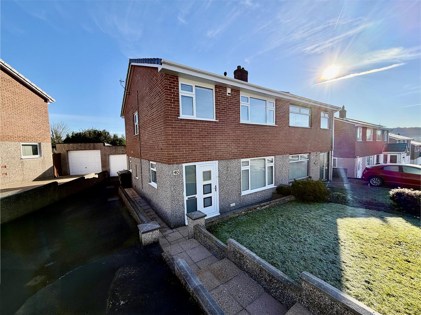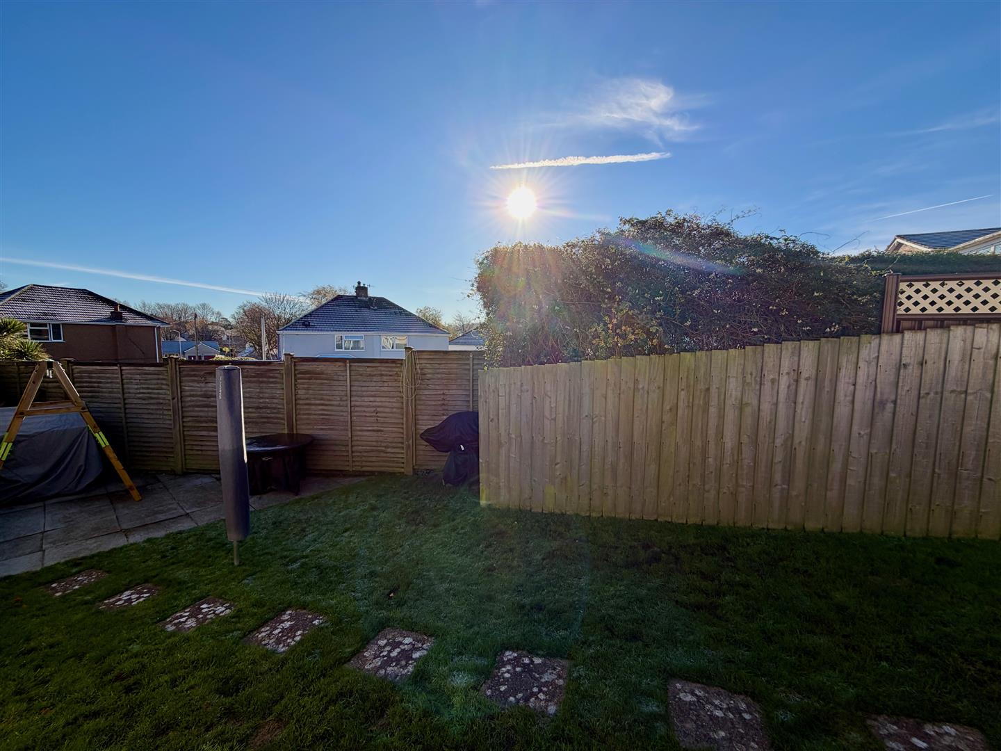 The property is approached via a slabbed walkway bordered by an area of lawn, a raised planter with mature shrubs and slate chippings. A driveway runs alongside through to the garage. A wooden gate provides access to the fully-enclosed rear garden which incorporates paved patio areas leading and an area laid to lawn. Outside power. Outside tap.
