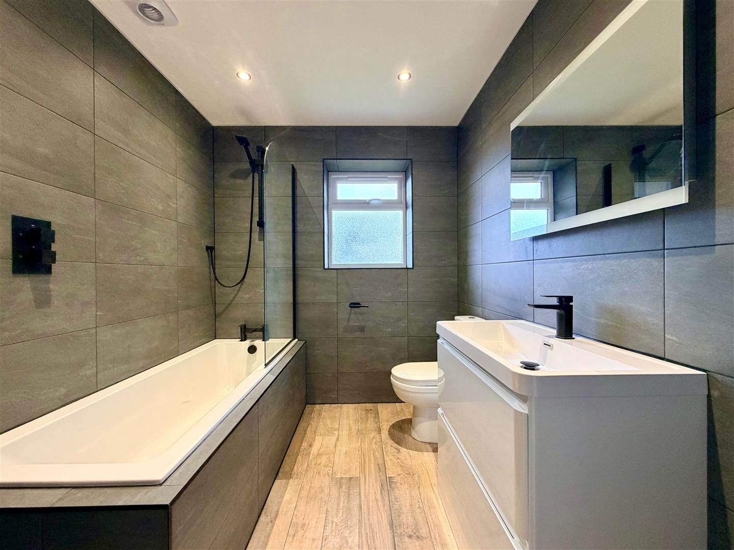 Comprising a bath with a shower system and a glass shower screen, large basin with storage beneath and wc. Wall-mounted towel rail/radiator. Tiled floor. Fully-tiled walls. Inset ceiling spotlights. Obscured window to the rear elevation.