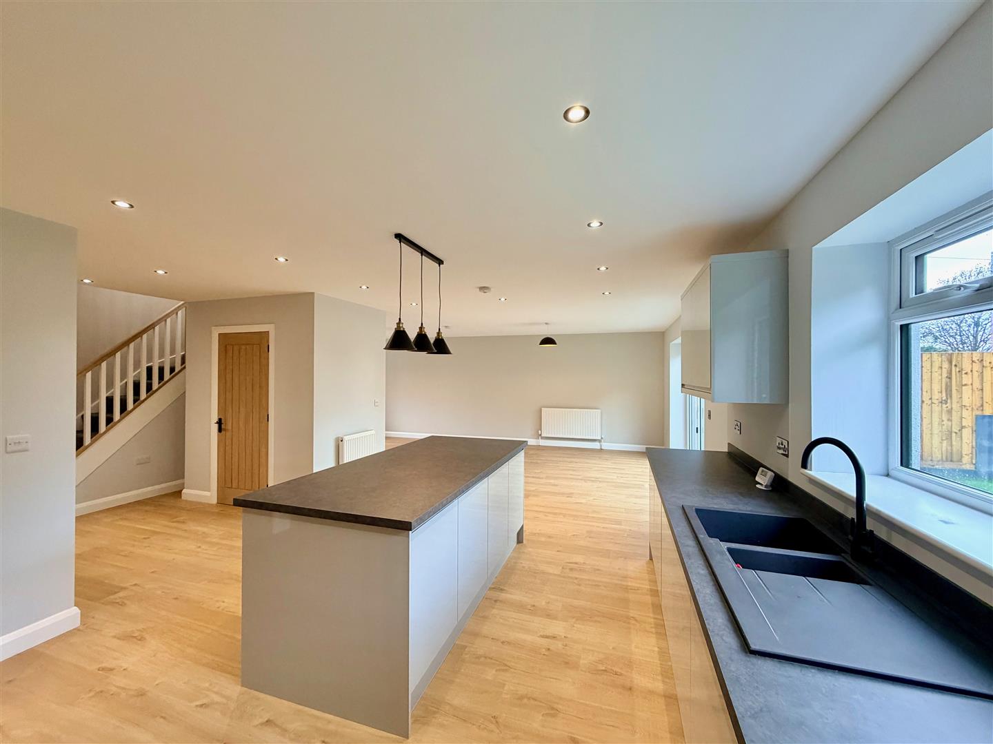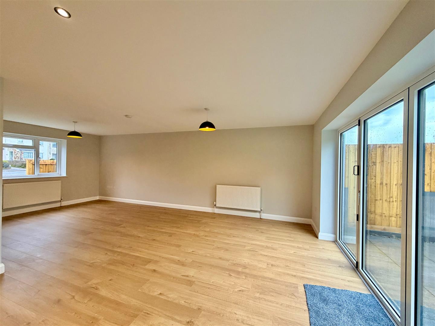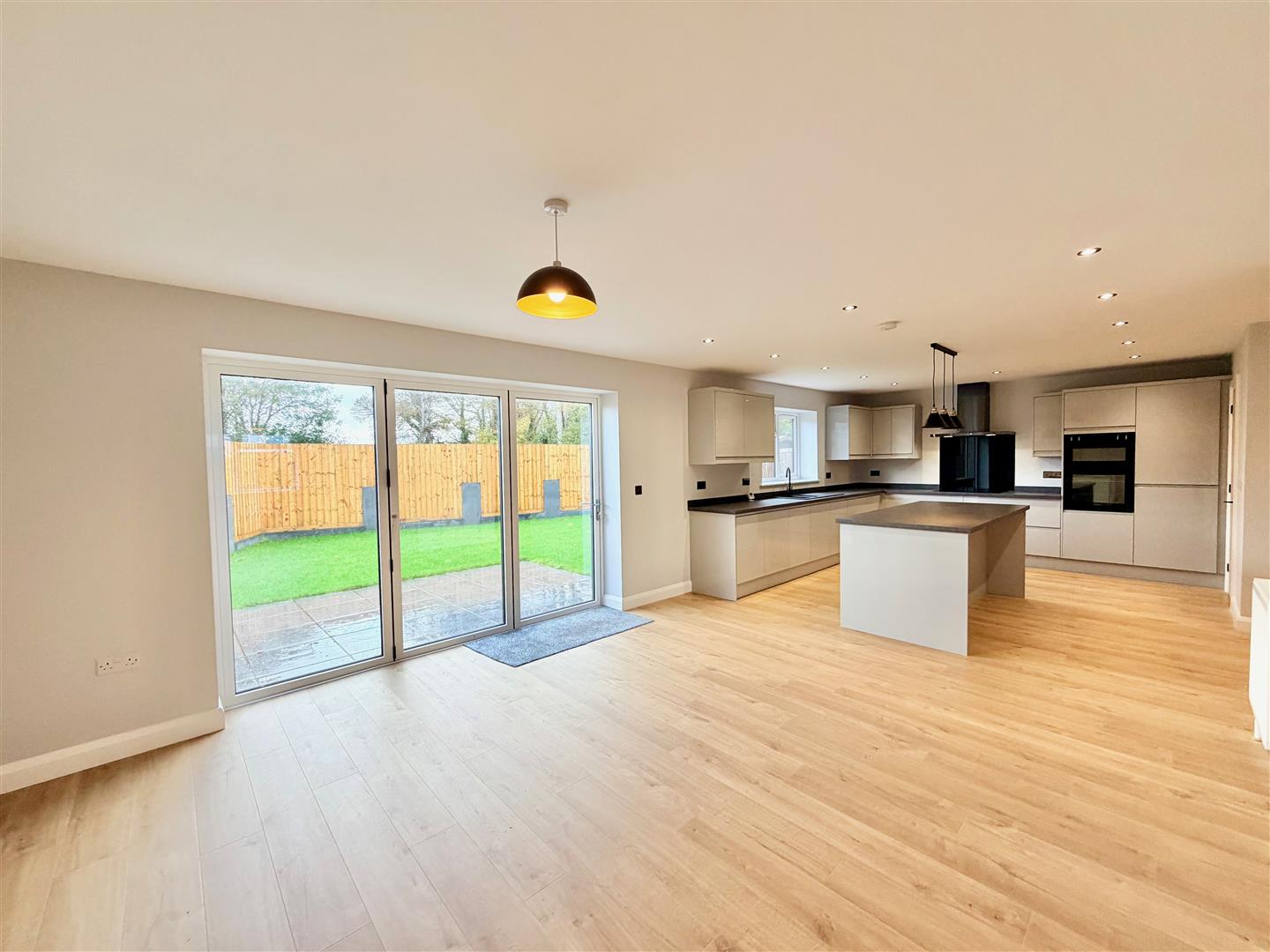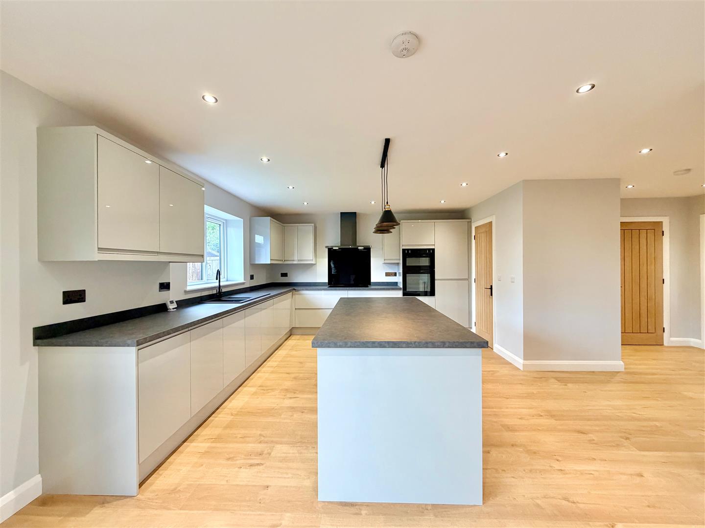 A superb open-plan room with ample space for seating and dining. The room is dual aspect with a windows to the front and rear elevations together with bi-folding doors overlooking the westerly-facing garden. Modern kitchen cabinets with matching island, matching work surfaces and splash-backs. Inset one-&-a-half bowl single drainer sink unit. Built-in double oven and grill. Inset hob with a glass splash-back and a cooker hood above. Integral fridge, freezer, and dishwasher. Bin storage. Inset ceiling spotlights.