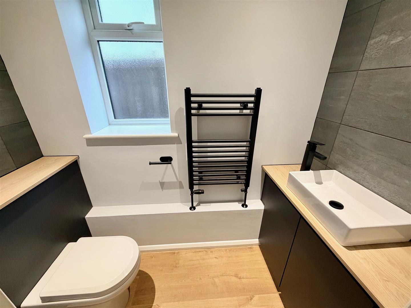 Fitted with a wc and basin with a cabinet beneath. Towel rail/radiator. Partly-tiled walls. Obscured window to the side elevation.