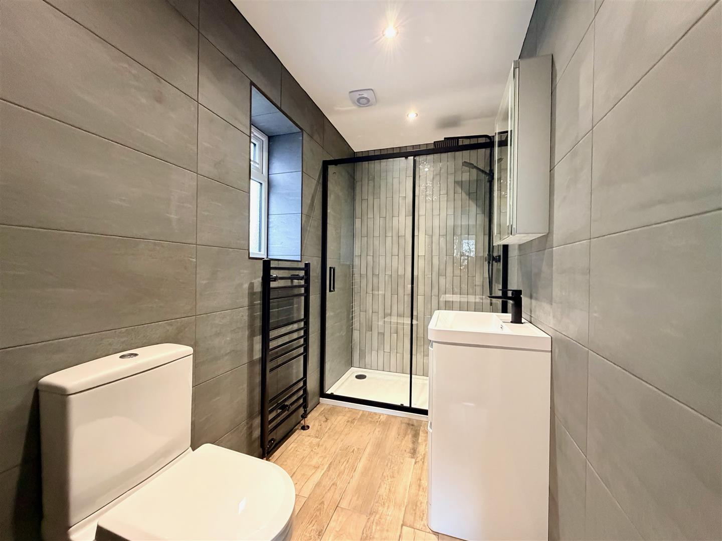 Comprising an enclosed double shower, wc and basin with storage beneath. Mirrored cabinet with lighting. Towel rail/radiator. Tiled floor. Fully-tiled walls. Inset ceiling spotlights. Obscured window to the side elevation.