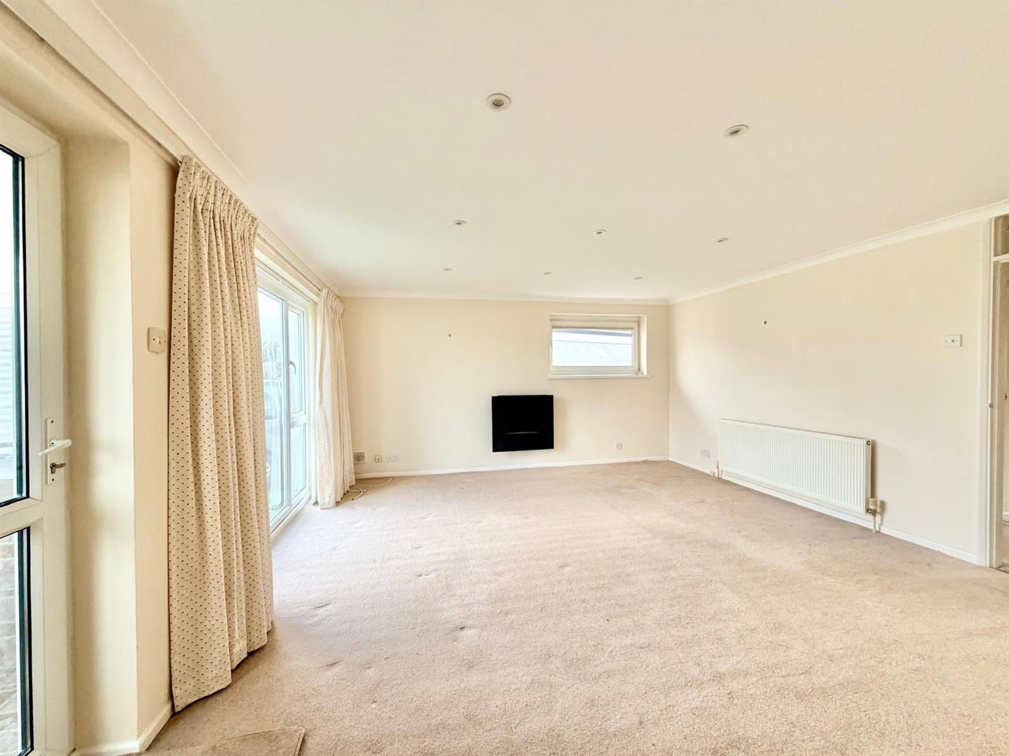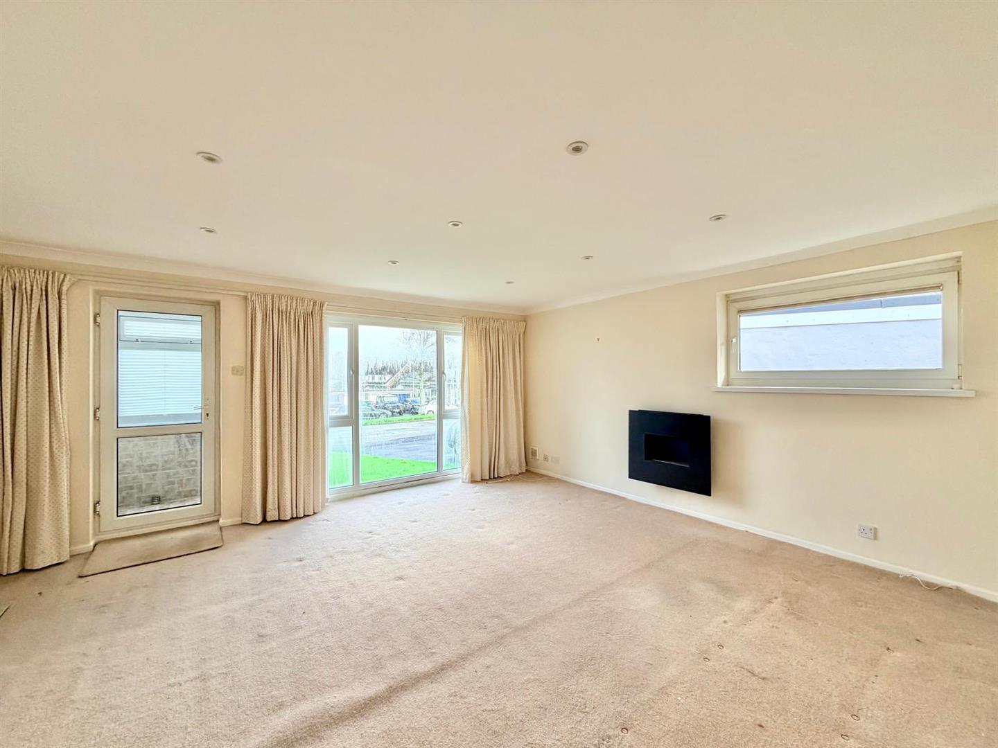 A dual aspect room with a full-height window with fitted blinds to the front elevation and a window with fitted blinds to the side elevation. Inset ceiling spotlights. Doorway leading into the inner hallway. Separate door opening into the kitchen.