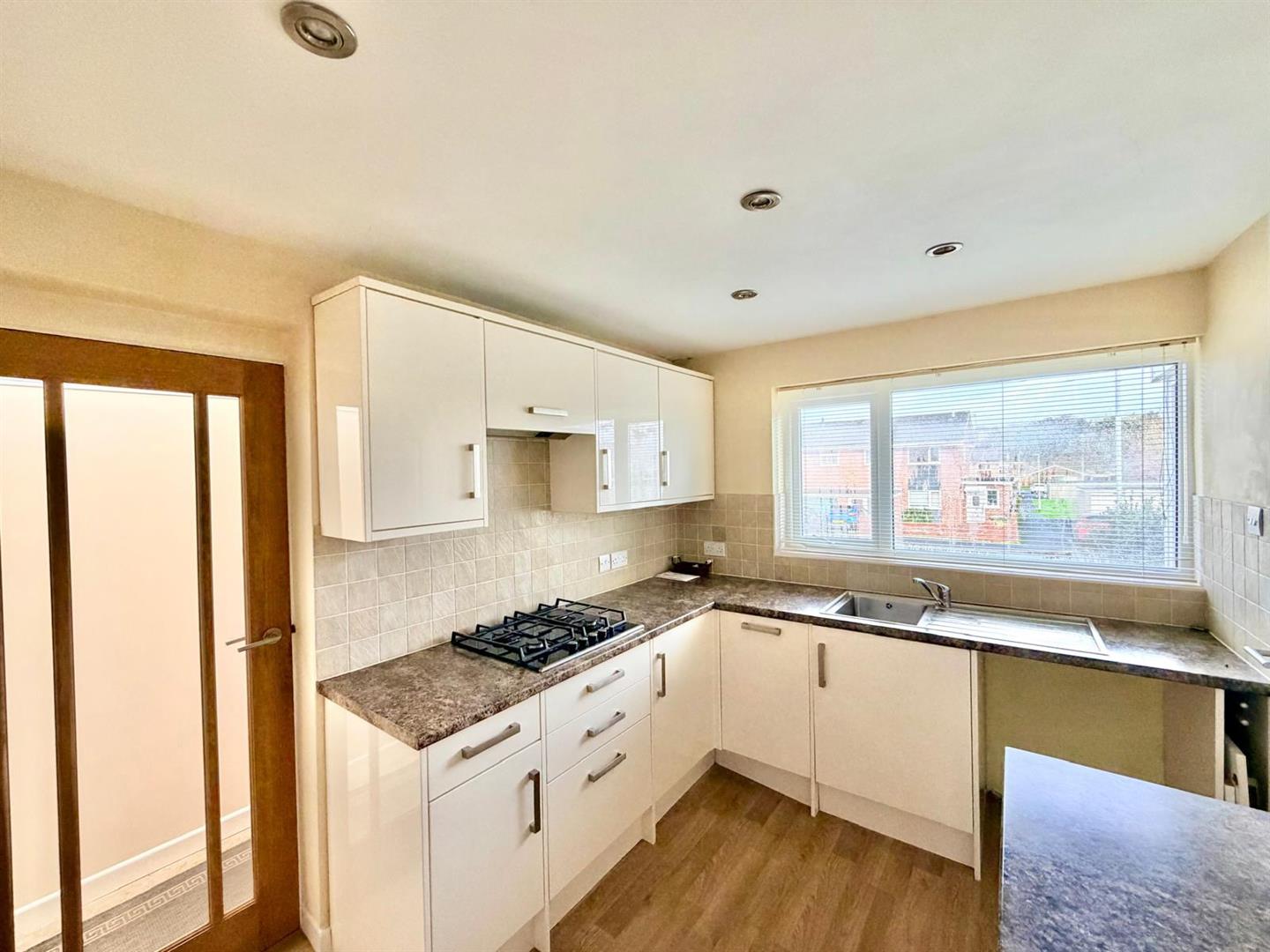 Range of base and wall-mounted cabinets with matching fascias, work surfaces and tiled splash-backs. Inset Bosch 4-burner gas hob. Built-in Bosch double oven and grill. Integral fridge and freezer. Built-in slimline dishwasher. Space and plumbing for washing machine. Partly-glazed door to the side opening into the rear passageway.