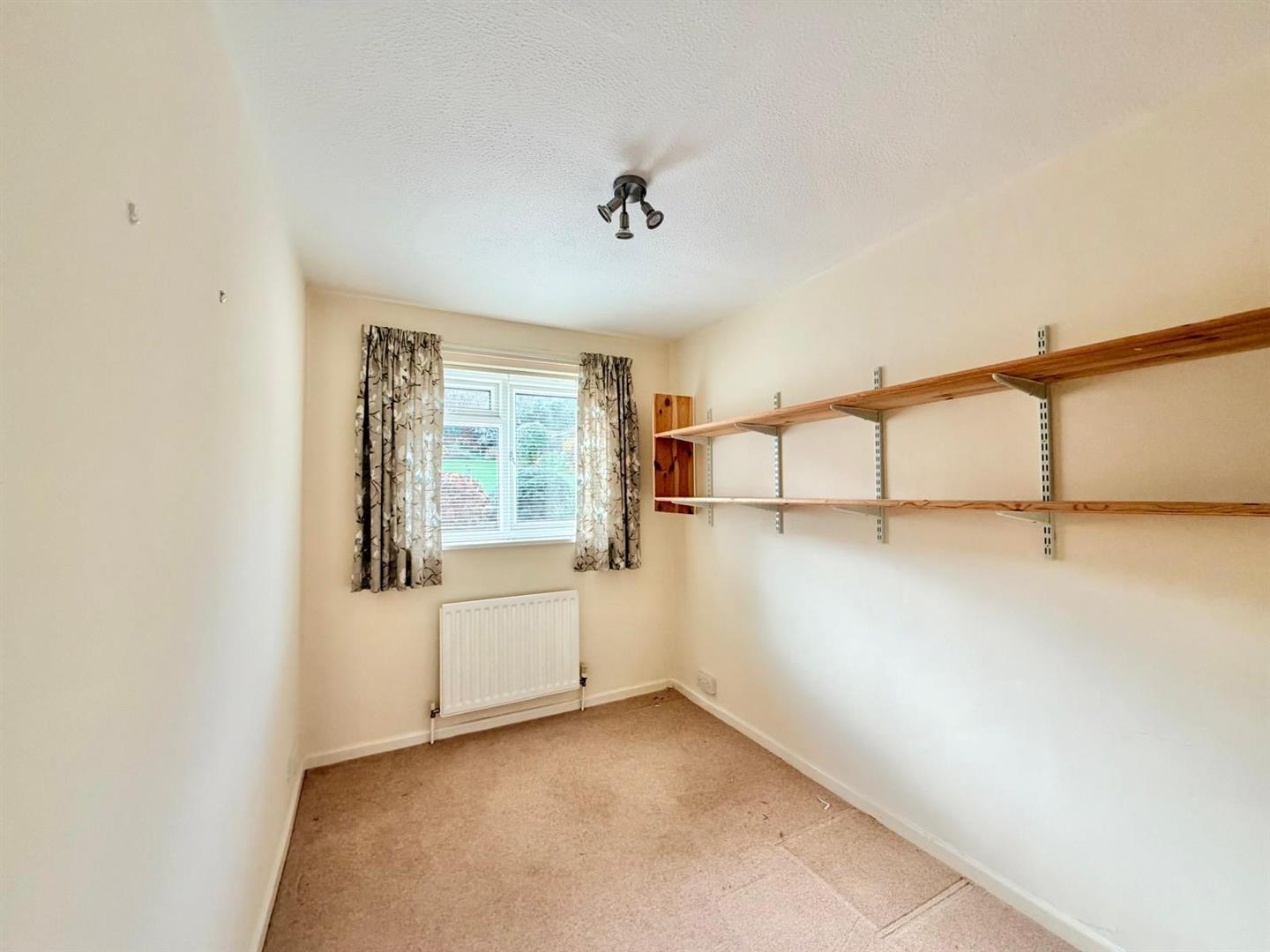 Window with a fitted blind to the rear elevation. Wall-mounted shelving.