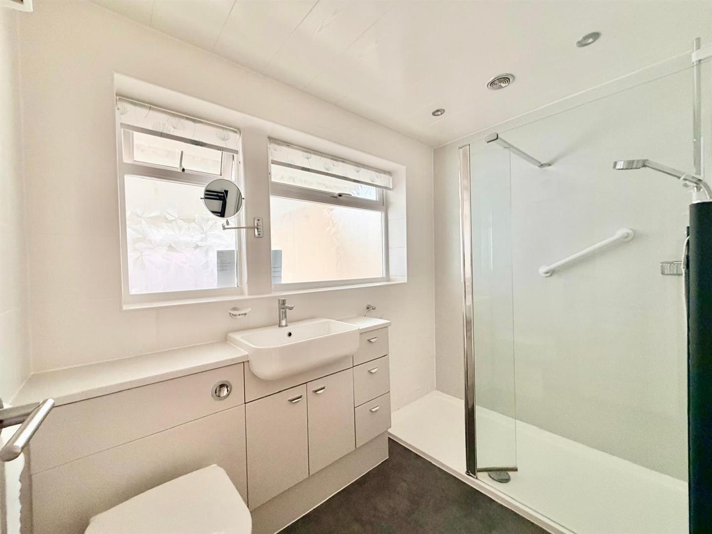 Comprising a large walk-in shower with a fixed glass screen and waterproof panelling, wc with a push button flush and a basin set into a cabinet concealing the cistern and providing storage. Towel rail/radiator. Wall-mounted fan heater. Fully-tiled walls. Panelled ceiling with inset ceiling spotlights. Obscured window to the side elevation.