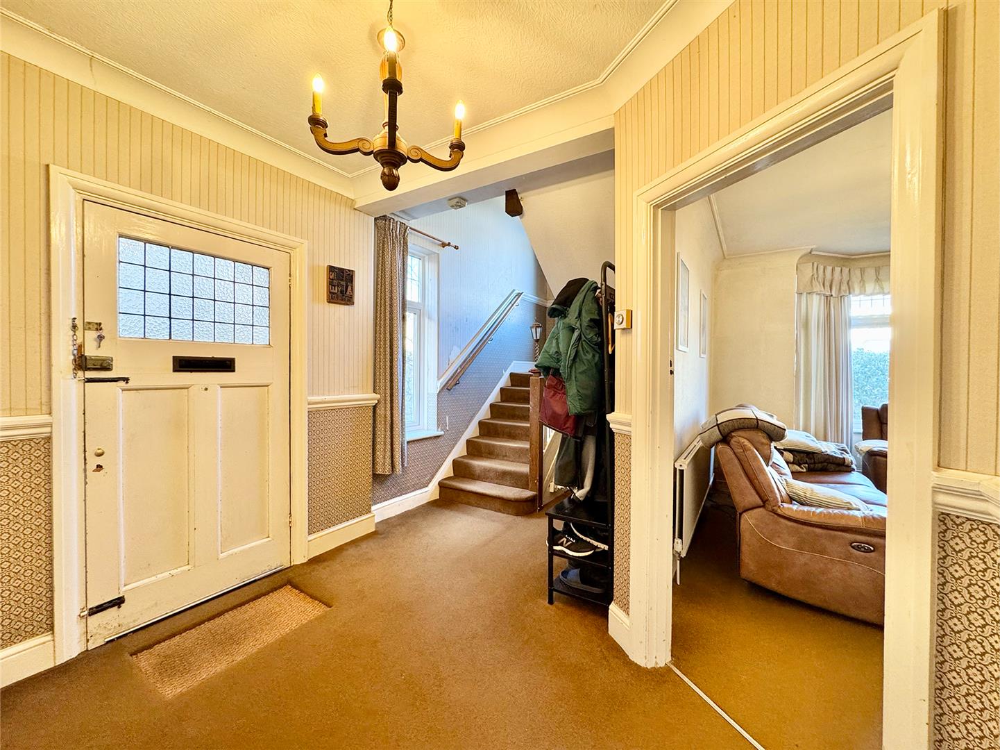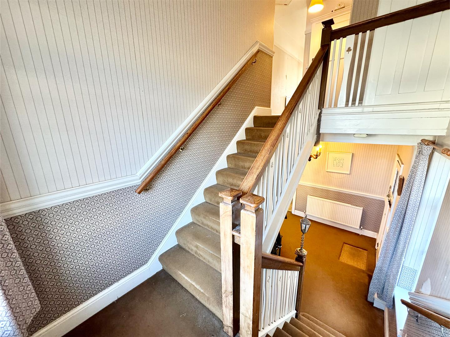 Staircase with timber newel post, banister & rails rises & turns to the first floor. Carved detailing. Under-stairs cupboard. Dado rail.