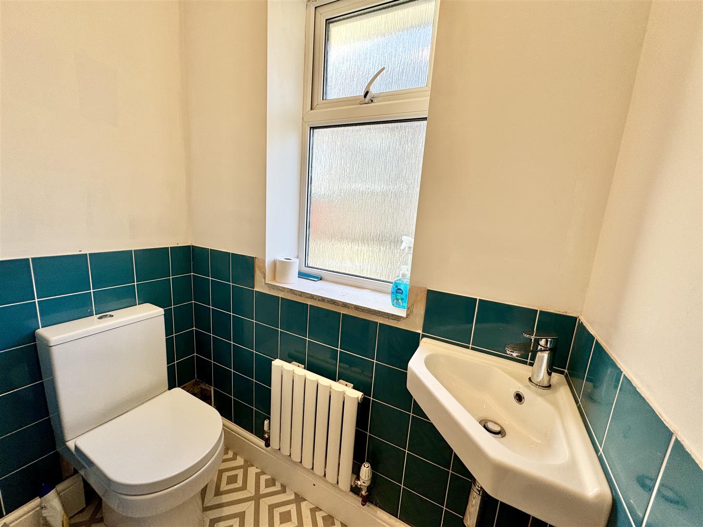 Shower room comprises a tiled shower, pedestal wash hand basin & close coupled wc.