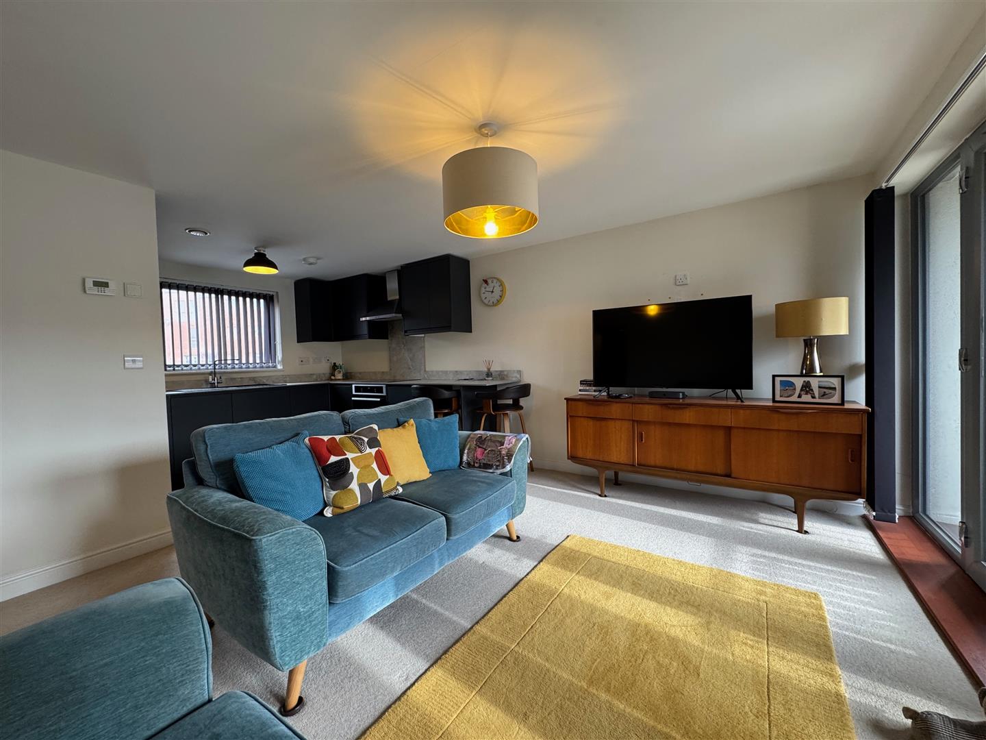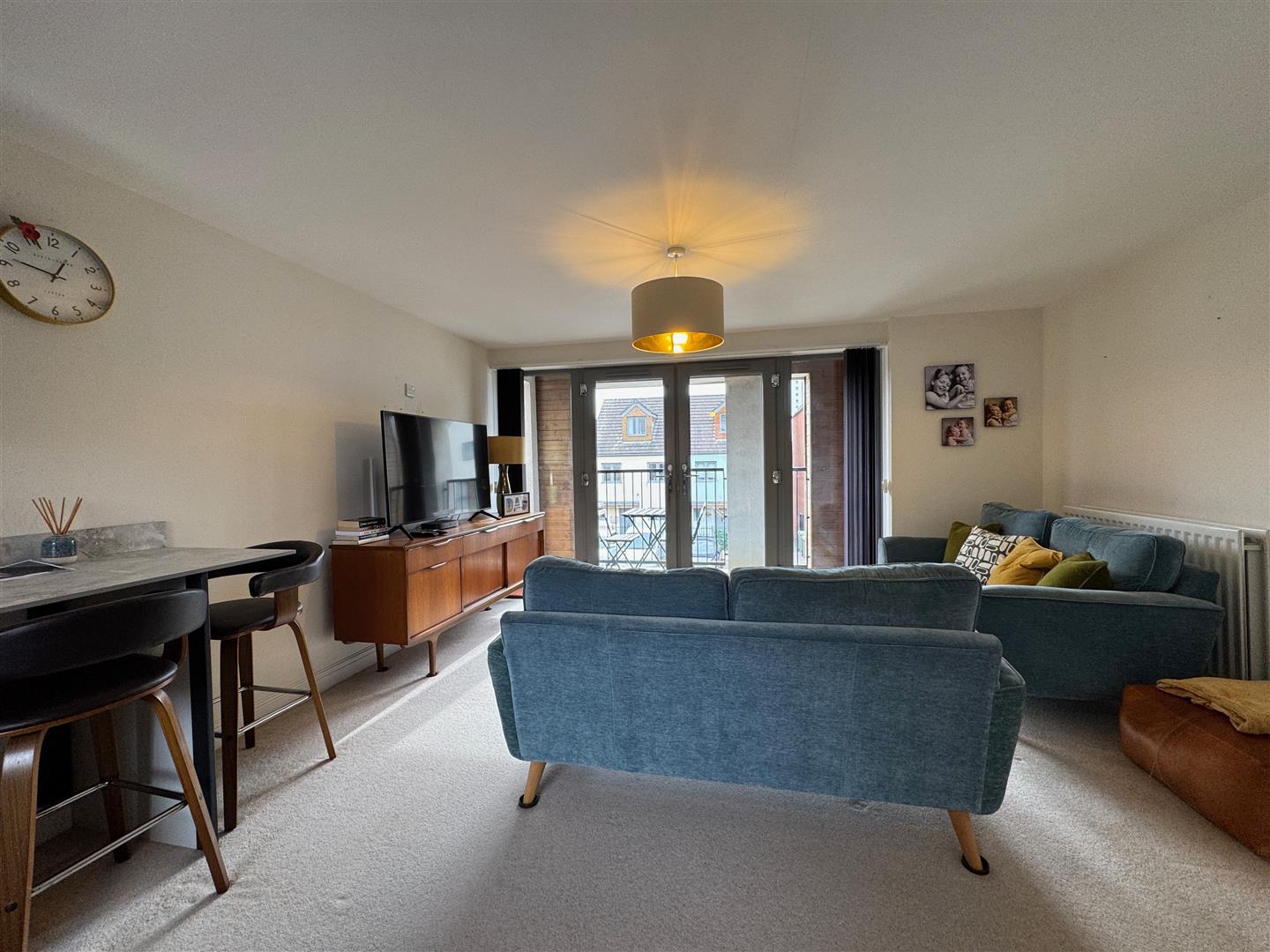 In the kitchen area there are matching base & wall-mounted units to include integrated oven, dishwasher & fridge/freezer. Square edge worktops have inset 4 ring induction hob with stainless steel filter hood over. Matching splash-backs. Sink unit with mixer tap. Breakfast bar area. Wood effect LVT flooring. uPVC double-glazed window to the rear. In the lounge/dining area uPVC double-glazed French doors open out to the balcony.
