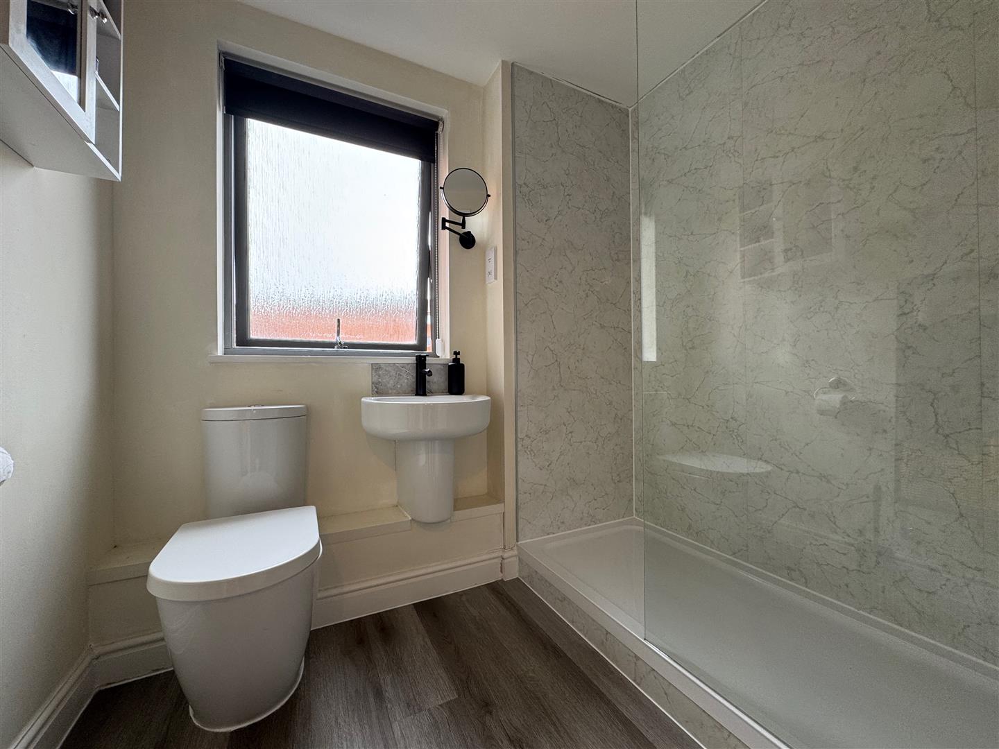 Matching suite of walk-in shower with dual shower-heads both rainfall & handheld, close coupled wc, wall mounted wash hand basin. Heated towel rail. Wood effect vinyl flooring. Obscured uPVC double-glazed window to the rear. Wall mounted shaver point. Extractor fan.