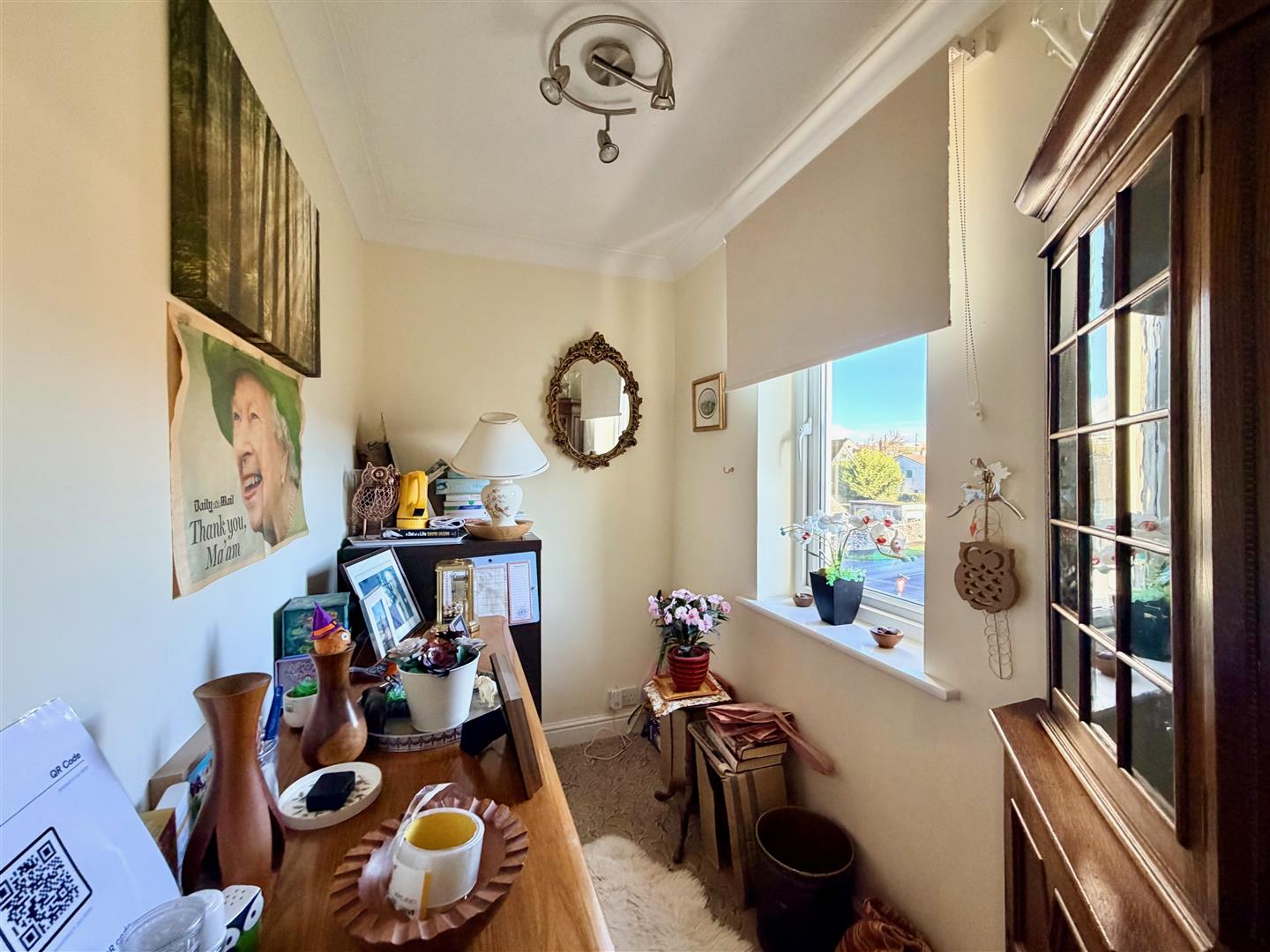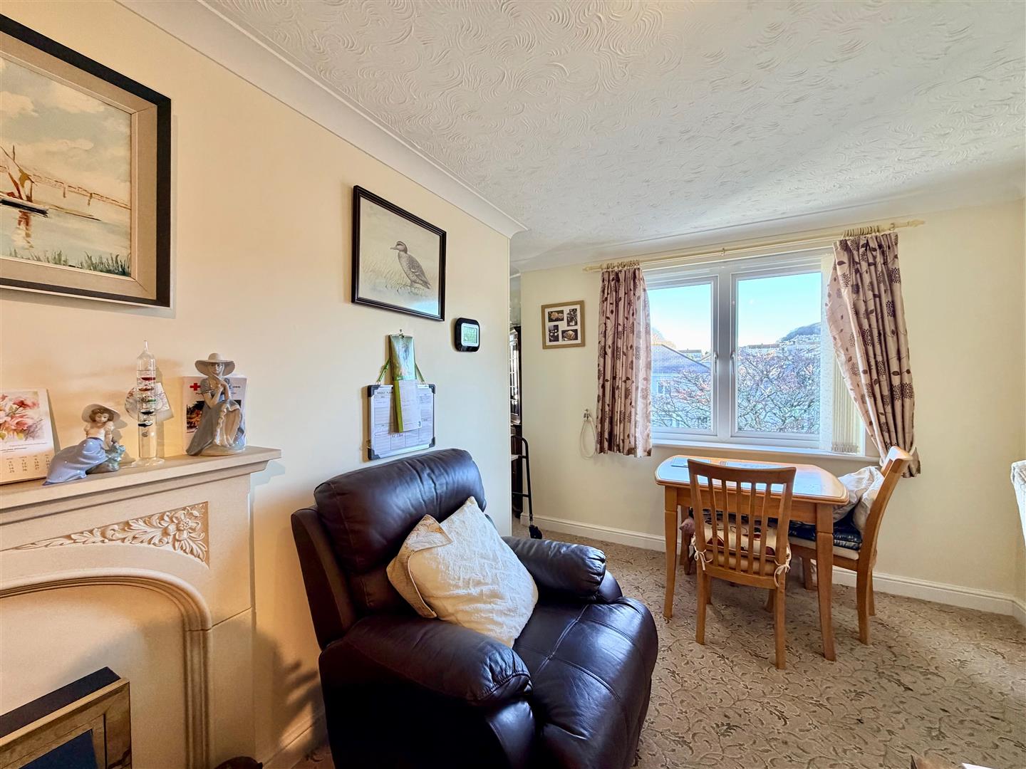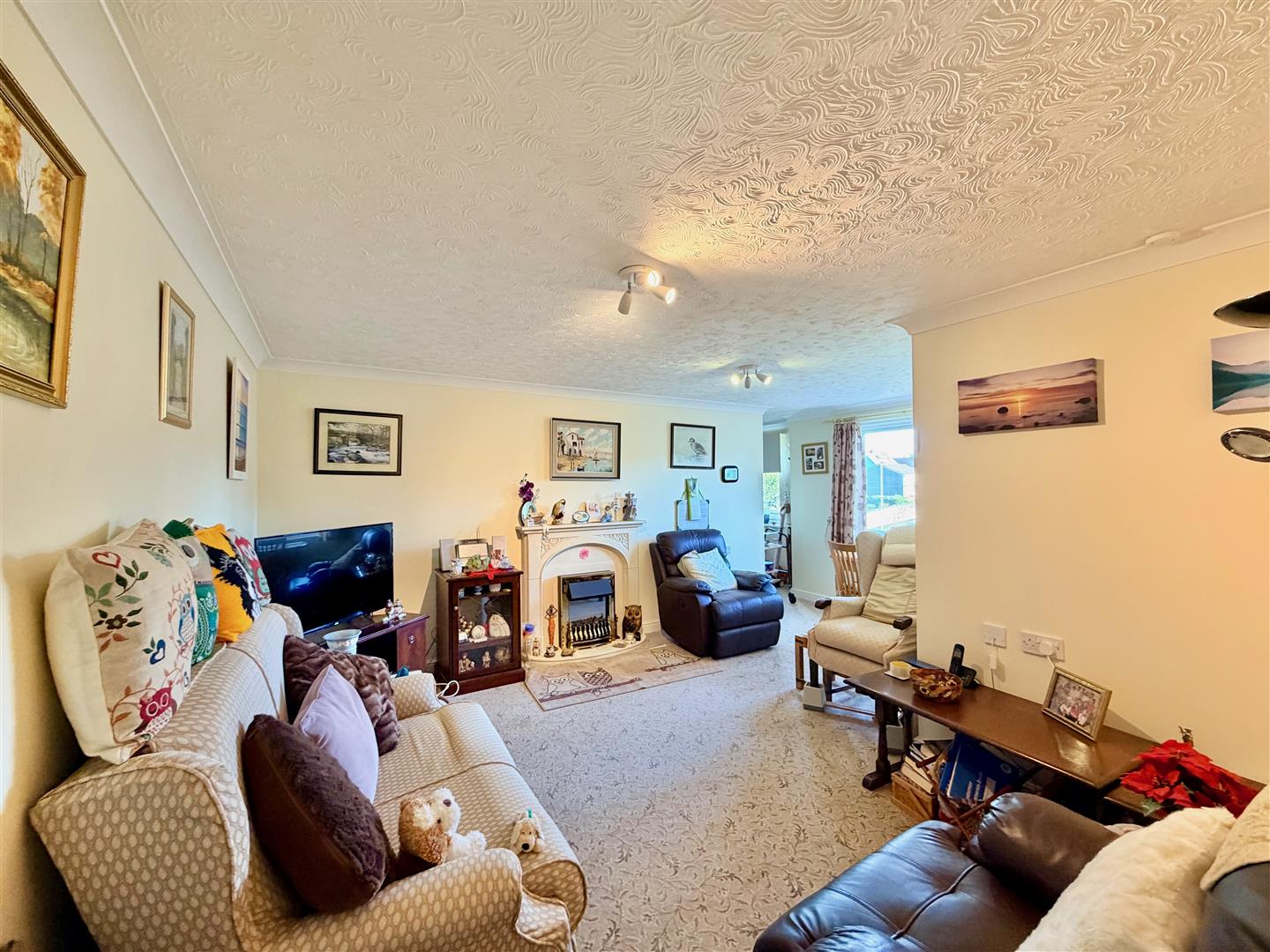 Ample space for seating and dining. Fireplace with an electric fire. Storage heater. Window with a fitted blind with views towards Dunstone Woods. Glazed double doors opening into the kitchen. Open-plan access into the study area.