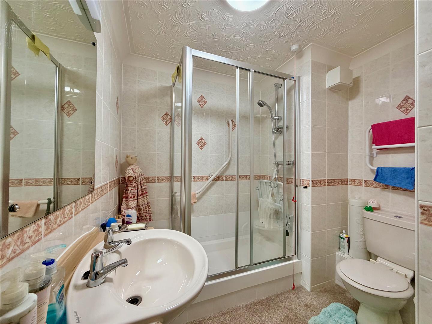 Comprising an enclosed shower with a built-in shower system, basin with a cupboard beneath and wc. Fan heater. Extractor. Fully-tiled walls. Doorway opening into the boiler cupboard with slatted shelving and housing the hot water cylinder.