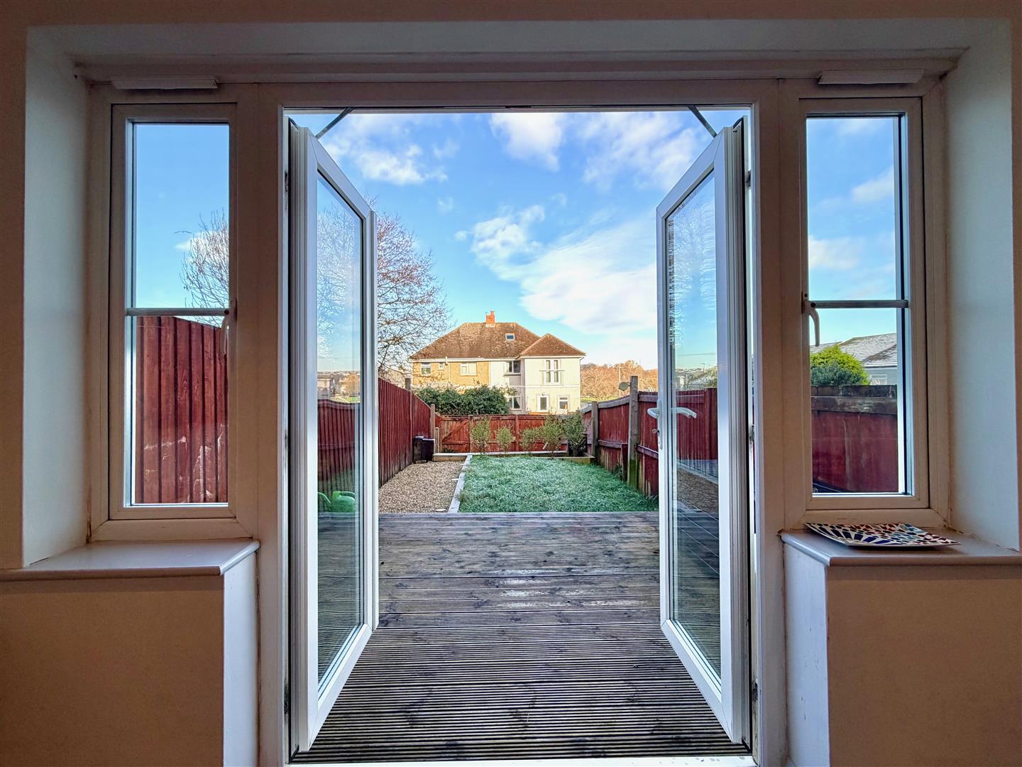 Window with views over the green towards Hooe Lake. Wall-mounted gas boiler concealed by a cabinet. Feature panelling. Fitted flooring continuing through from the hallway.