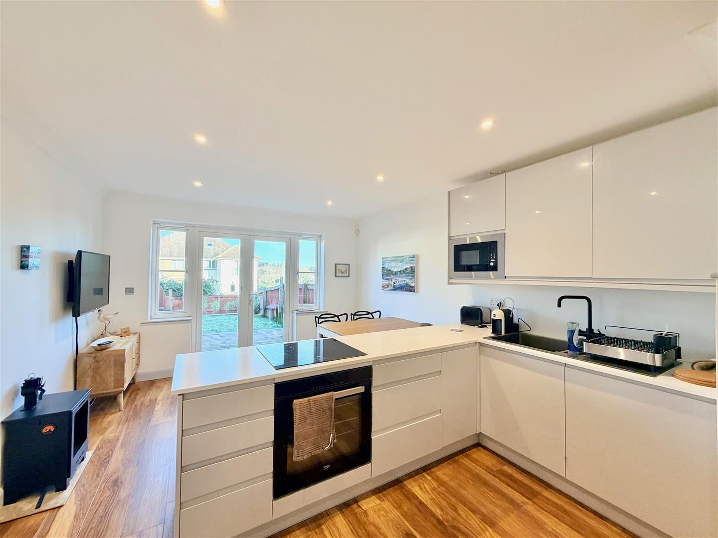 Situated on the lower floor with fitted flooring throughout. Fitted kitchen with a range of base and wall-mounted cabinets with matching fascias and matching work surfaces. Built-in oven and hob. Inset single drainer sink unit. Integral fridge and freezer. Under-stairs storage cupboard. Space for dining and seating. French doors to the rear with window either side overlooking the garden providing views over the green and towards Hooe Lake. Inset ceiling spotlights.
