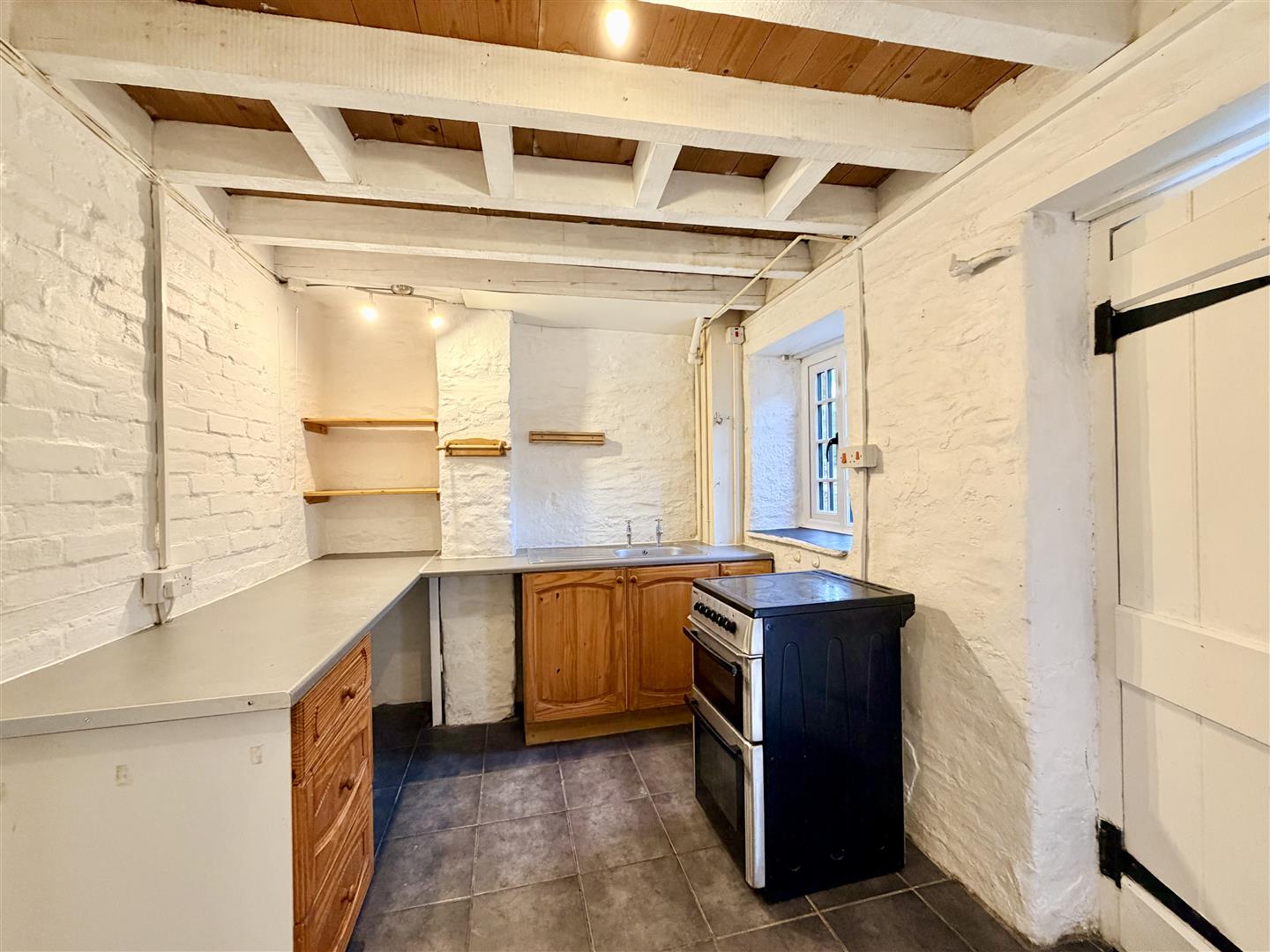 Tiled floor. Base mounted cabinets with work surfaces. Stainless steel single drainer sink unit. Space for free standing appliances. Window overlooking the courtyard doorway leading to the courtyard walk-in pantry, also housing the electric meter & consumer unit.