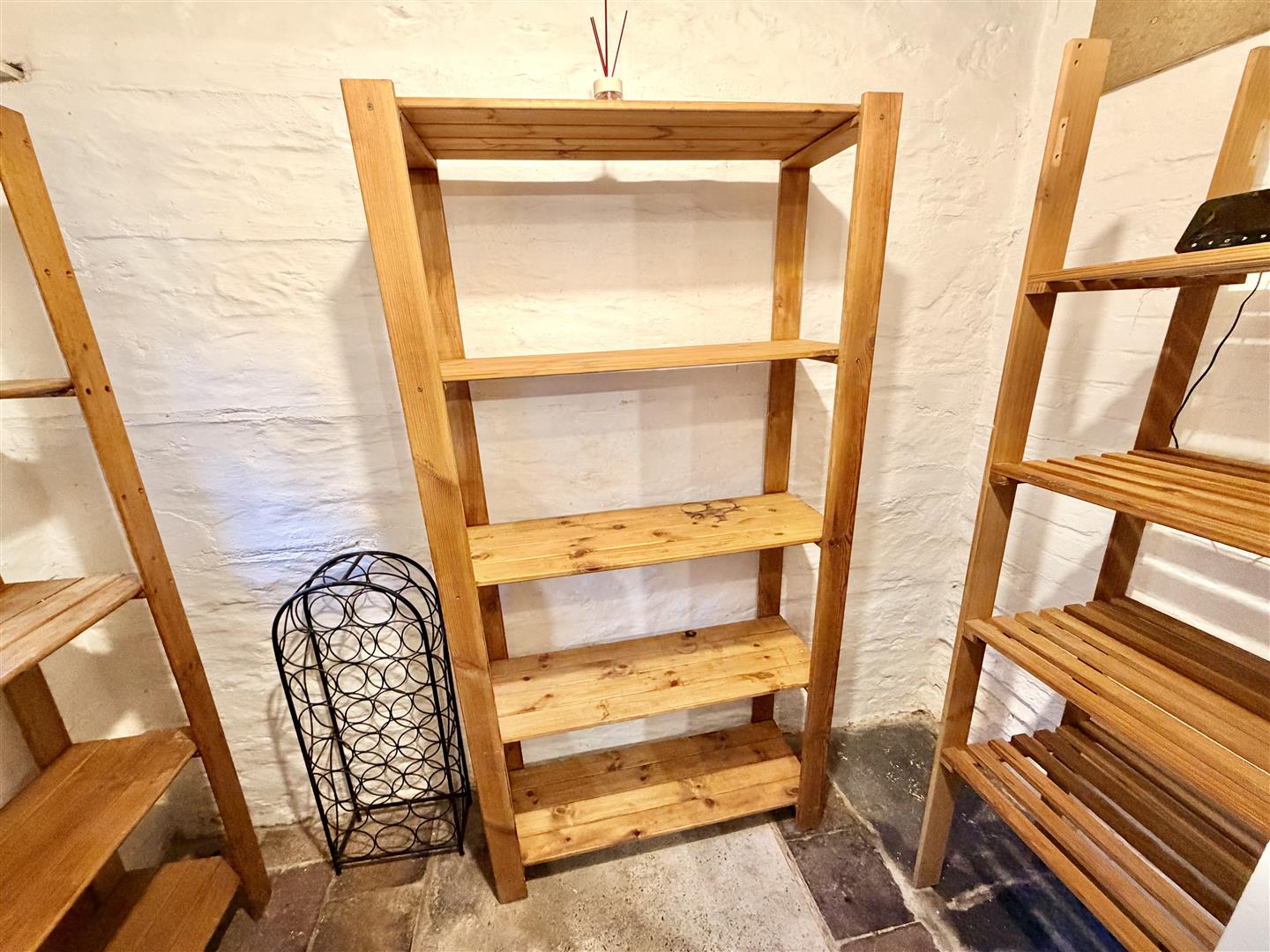 Window overlooking the courtyard. Exposed floorboards. Electric heater. Cupboard with shelving.