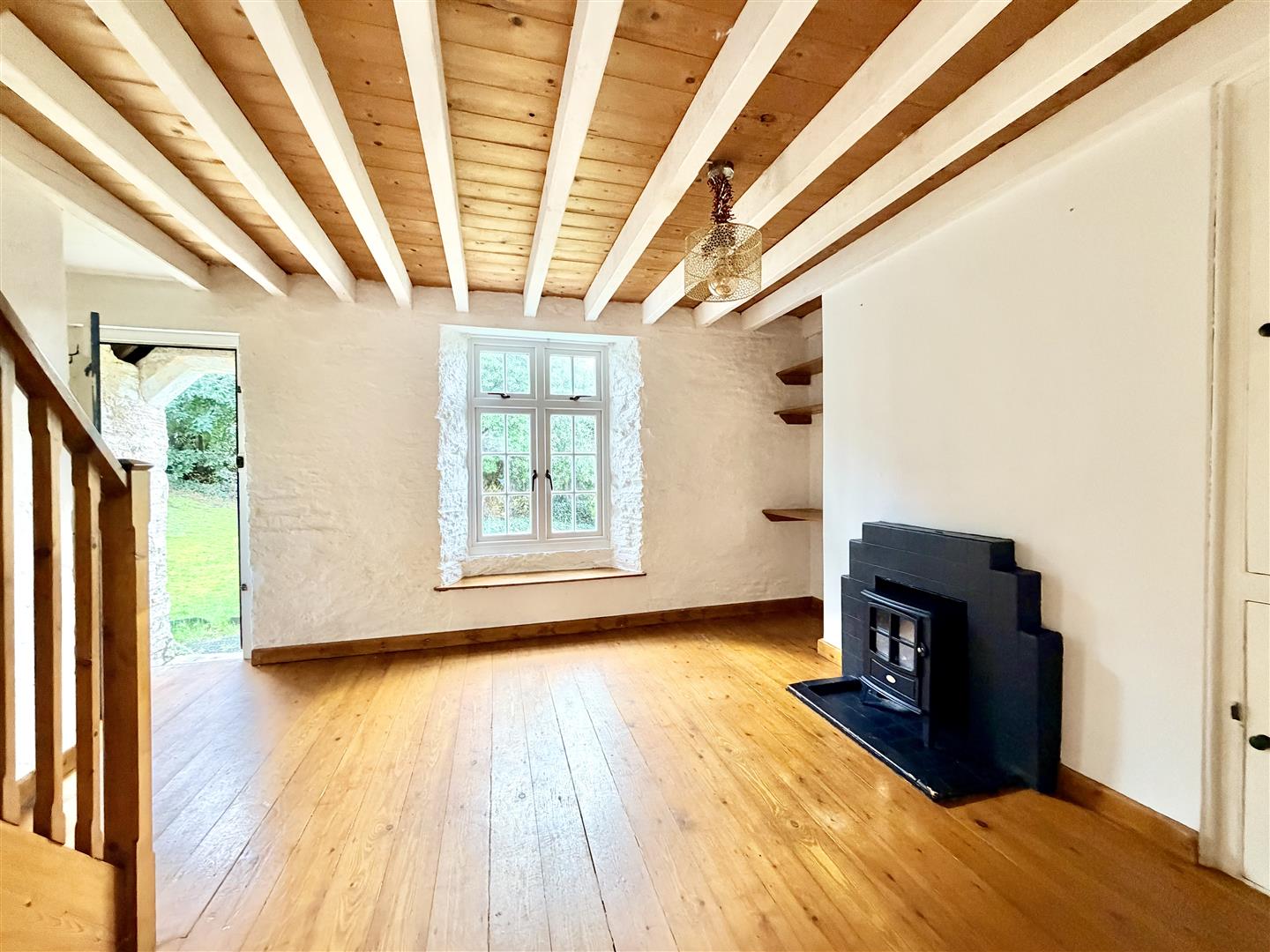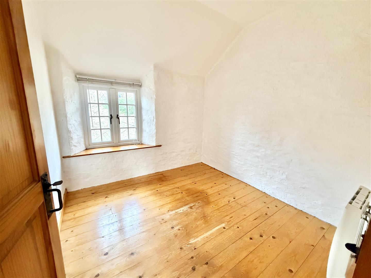 Window overlooking the gardens & Hooe Lake. Exposed floor boards. Wall mounted electric heater. Cupboard to one side of the chimney breast with shelving. Under-stairs storage cupboard. Doorway opens into the kitchen.