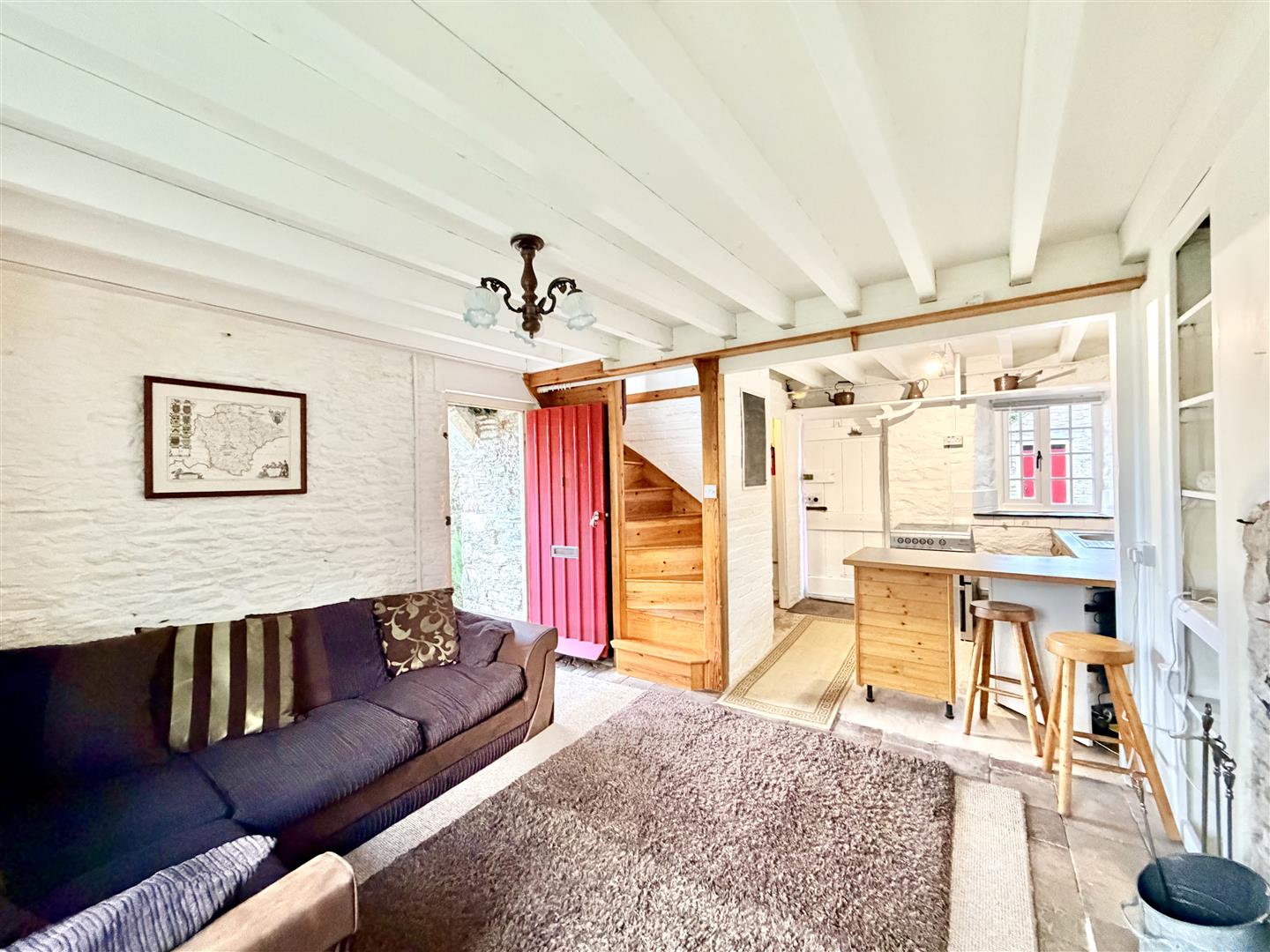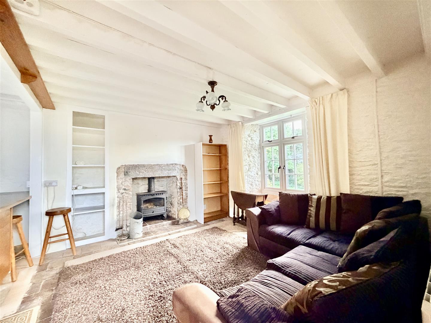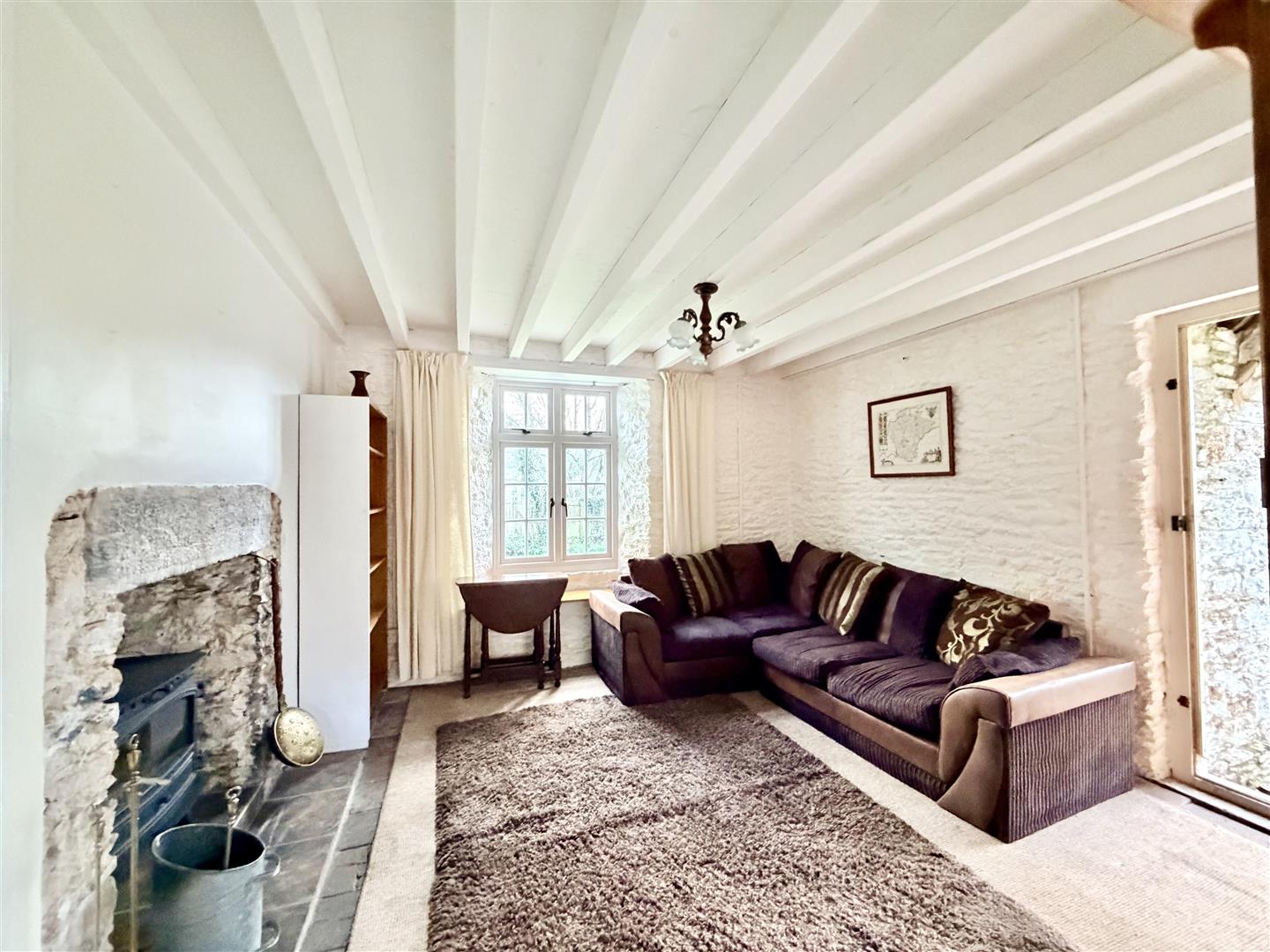 Provides ample space for seating. Stone fireplace with wood burner & window overlooking the gardens & Hooe Lake. The kitchen area has base mounted cabinets with work surfaces, stainless steel sink with tiled splash-backs & window overlooking the courtyard. Space for freestanding appliances. Shelving. Doorway to rear courtyard.