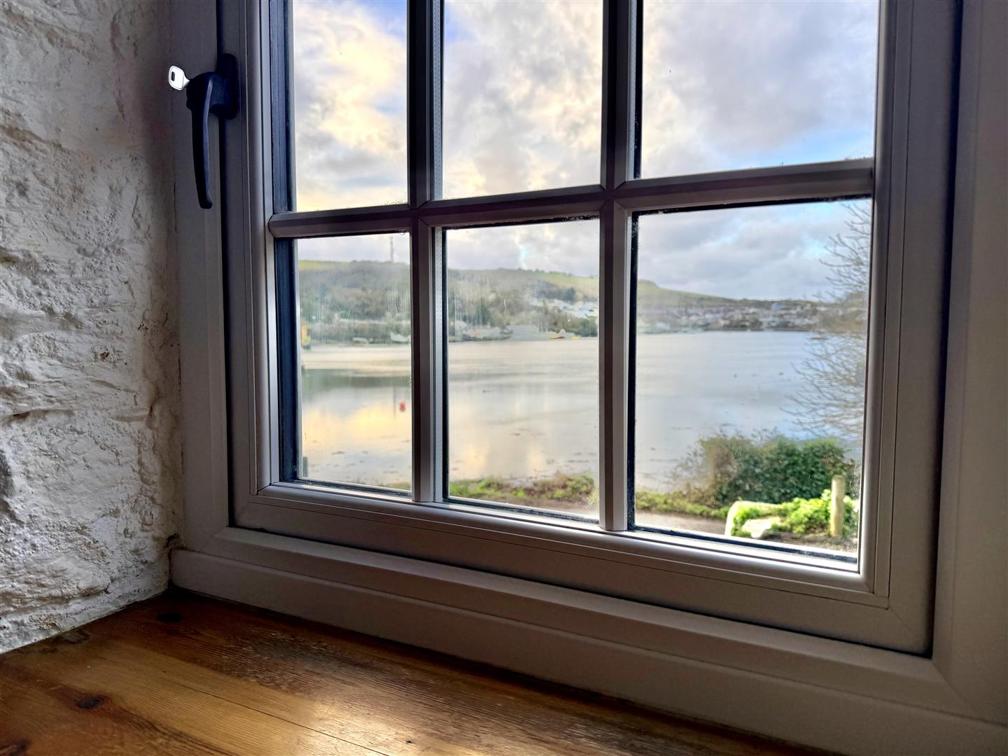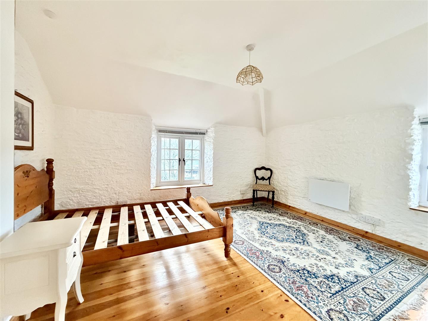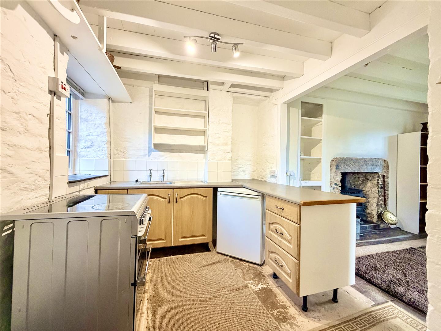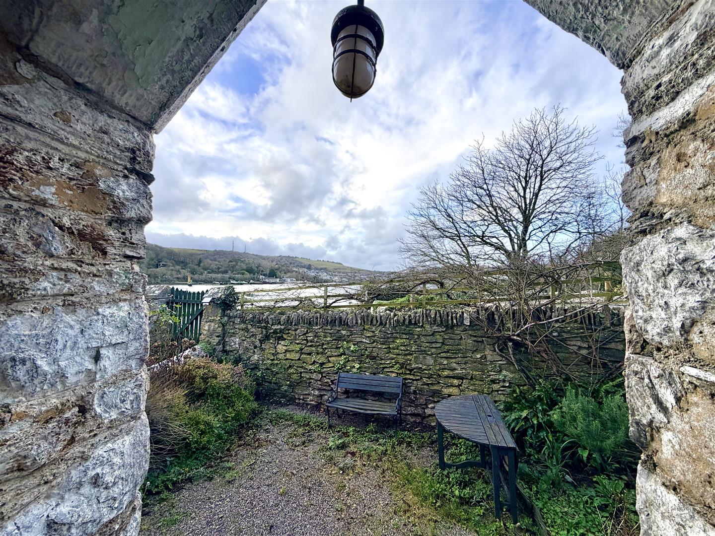 Provides ample space for seating. Stone fireplace with wood burner & window overlooking the gardens & Hooe Lake. The kitchen area has base mounted cabinets with work surfaces, stainless steel sink with tiled splash-backs & window overlooking the courtyard. Space for freestanding appliances. Shelving. Doorway to rear courtyard.