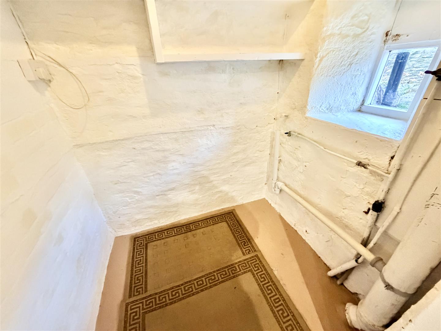 Shelving. Plumbing for washing machine. Electric meter & consumer unit.