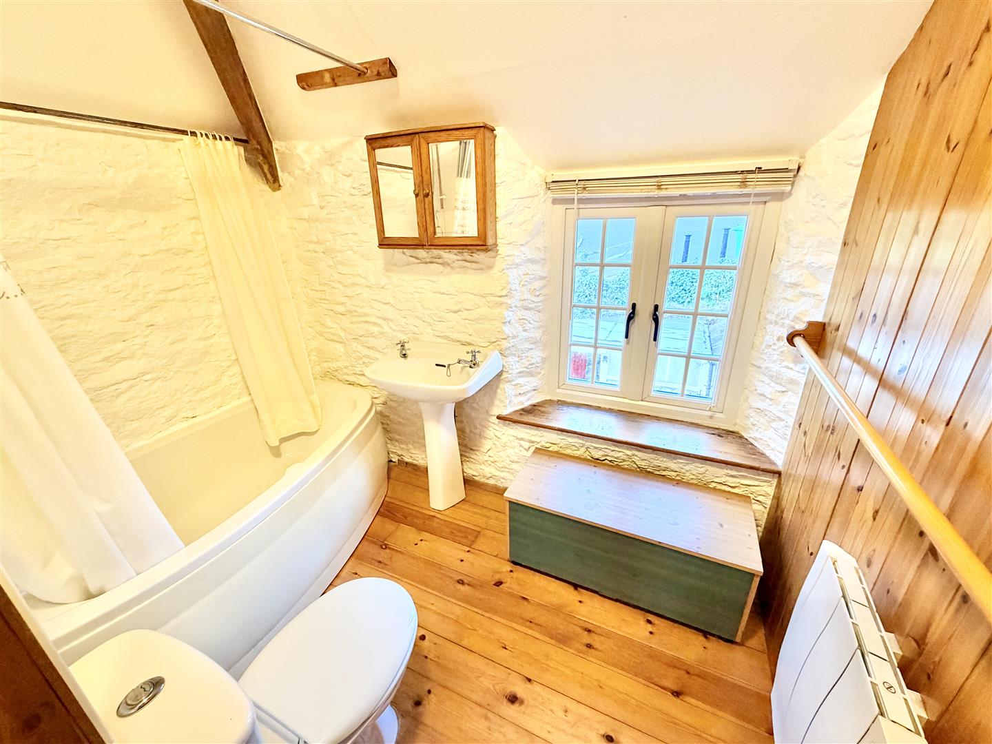 Comprises bath, pedestal basin & wc. Part-tiled walls. Electric shower system over the bath with shower rail & curtain. Wall mounted electric heater. Window. Over-stairs cupboard housing the hot water cylinder.