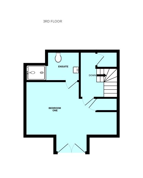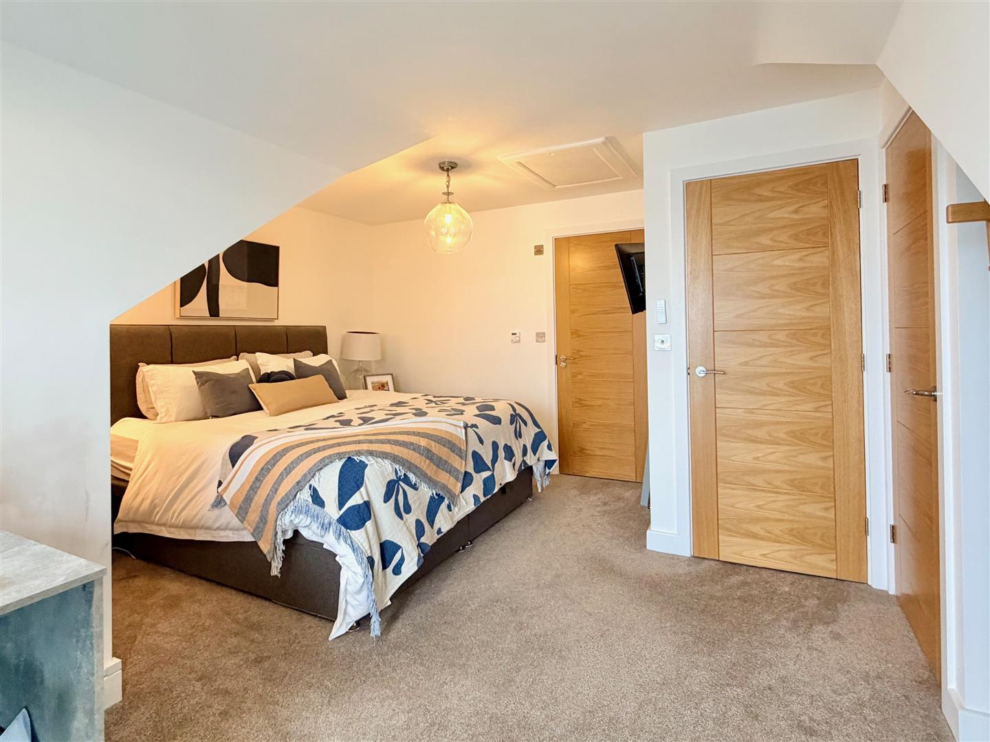A superb master bedroom situated on the top floor with French doors opening onto a glass and stainless-steel Juliette balcony. Loft hatch. Alcove for storage. Over-head storage cupboard. Doorway opening into the ensuite shower room.