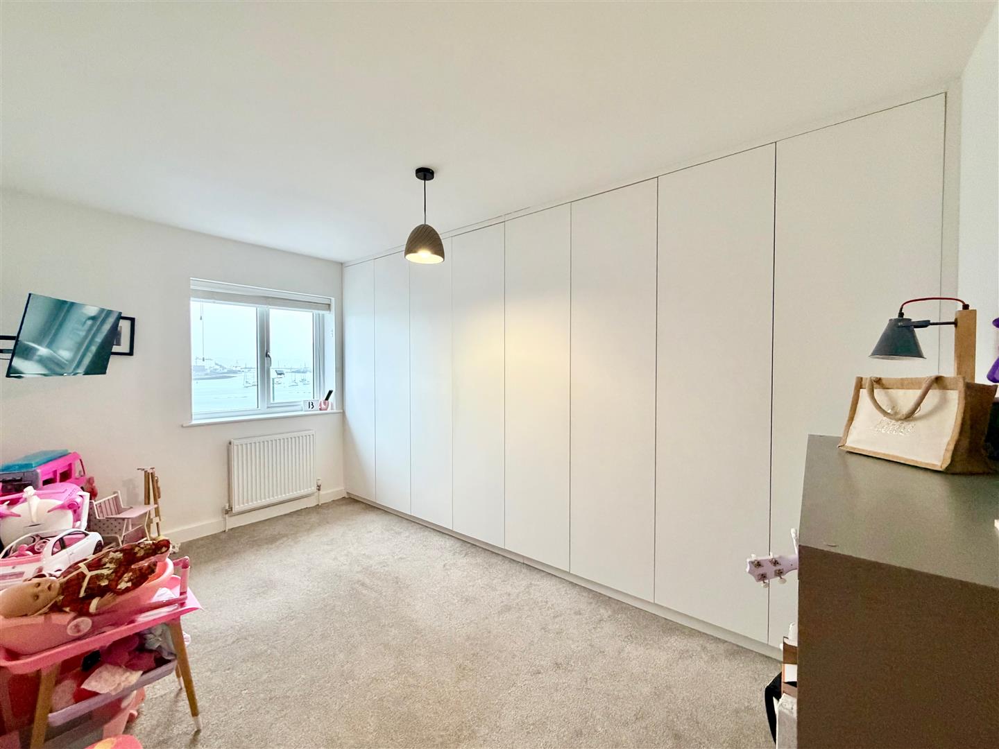 Window to the front elevation with fantastic water views. Full-width range of built-in wardrobes and cupboards fitted with hanging rails and shelving.