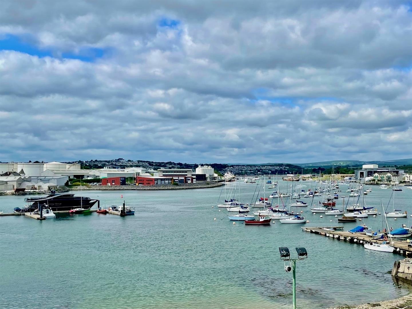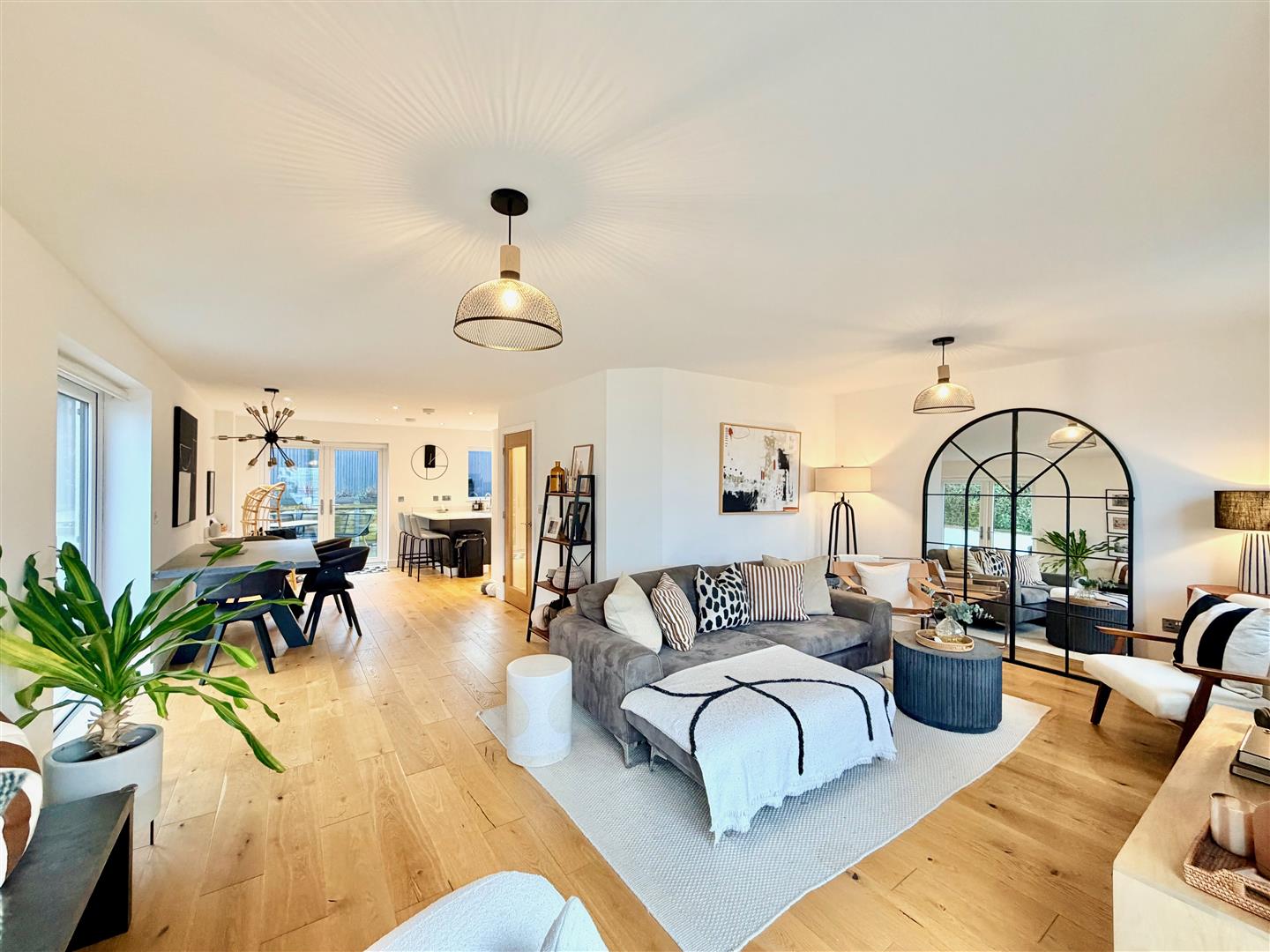 Occupying the first floor. Triple aspect with windows to the front, side and rear elevations, 3 sets of French doors opening onto the balconies to the front and side plus the rear garden. Oak flooring throughout. From the front there are fantastic views of the Cattewater, towards Oreston and down the Plym estuary with views of Dartmoor beyond. Ample space for seating and dining. The kitchen area is fitted with a range of contrasting base and wall-mounted cabinets with matching work surfaces and splash-backs. Breakfast bar. Inset stainless-steel one-&-a-half bowl single drainer sink unit. Built-in double oven and grill. Separate hob. Integral dishwasher. Integral fridge-freezer. Inset ceiling spotlights.