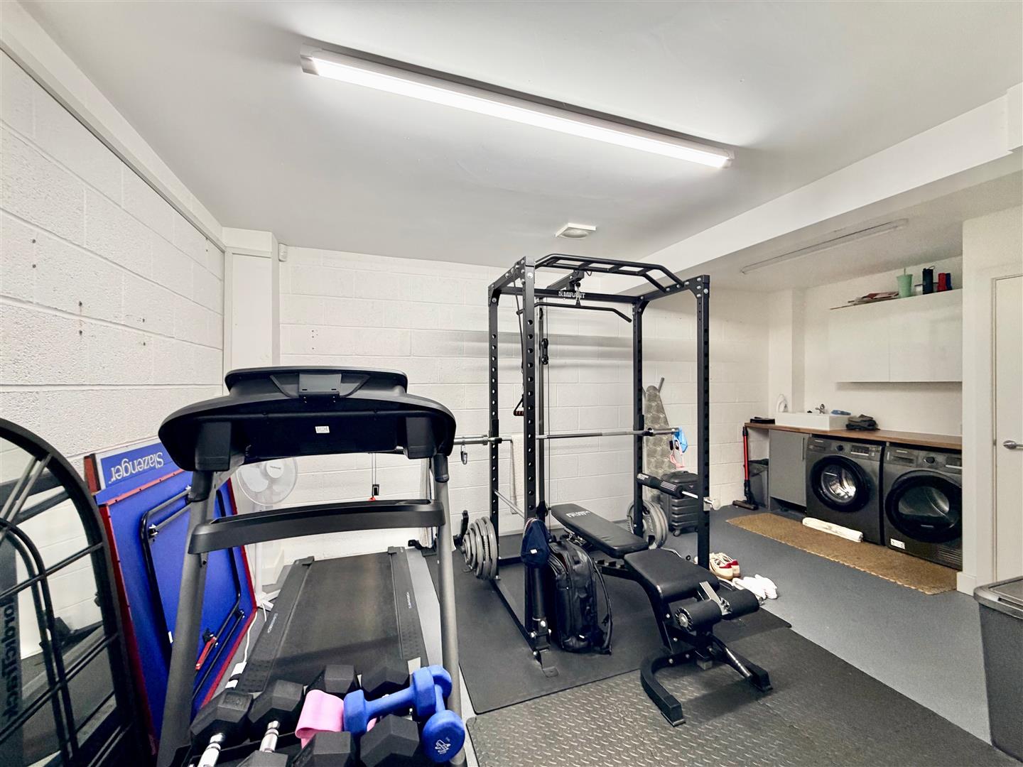 A generous garage with a remote door to the front elevation. Cupboard housing the hot water cylinder. Utility area with storage cabinets, work surface and space for a washing machine and tumble dryer. Power and lighting. Consumer unit.