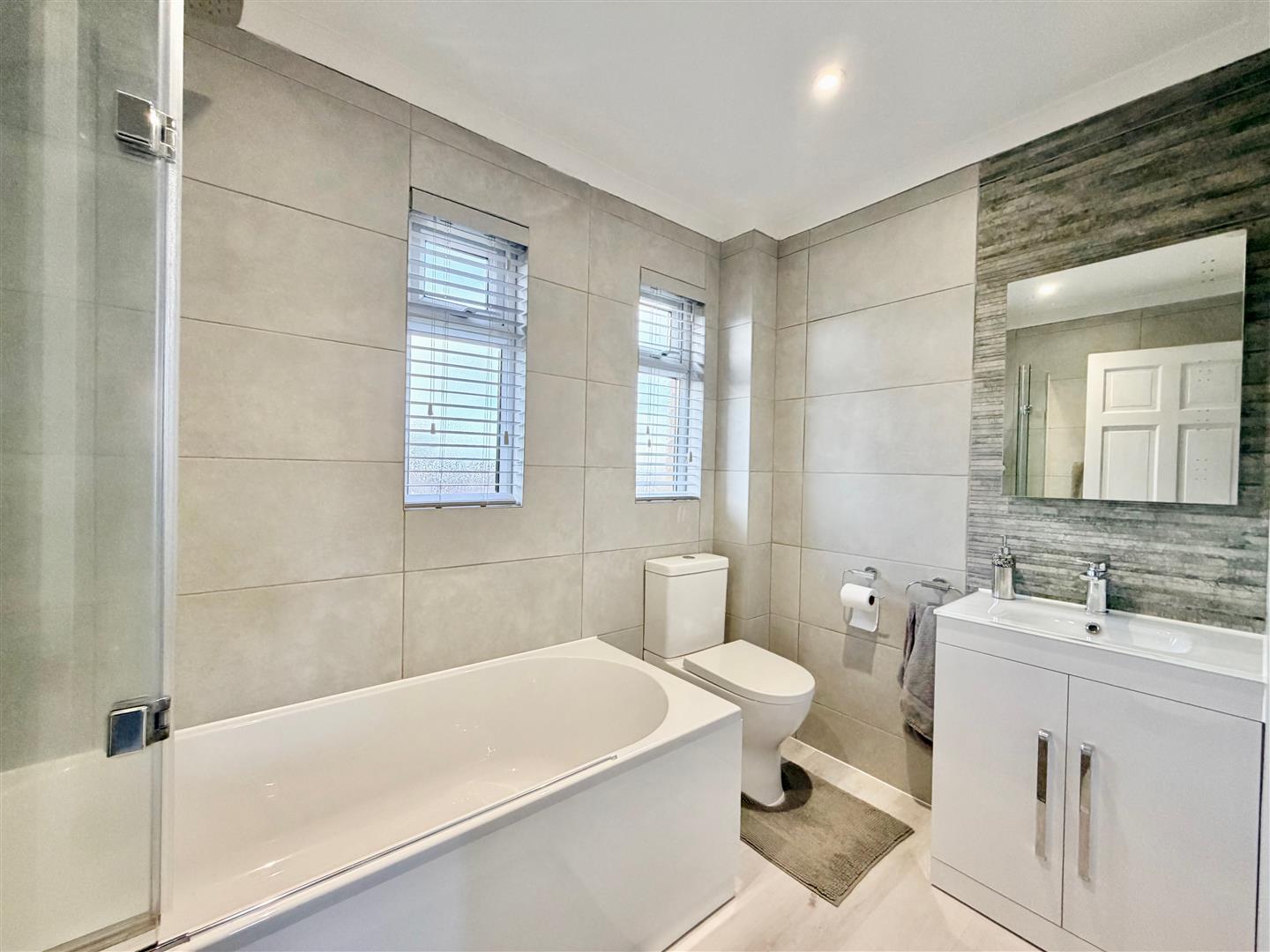 Superbly-fitted and comprising a bath with a built-in shower system over and a glass screen, basin with a cupboard and wc. Fully-tiled walls. 2 windows with fitted blinds to the rear elevation.