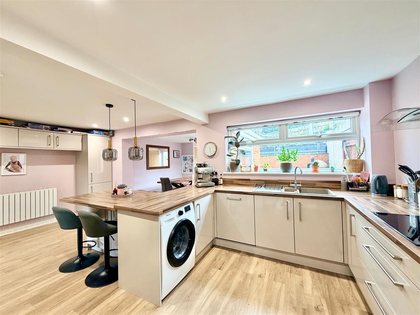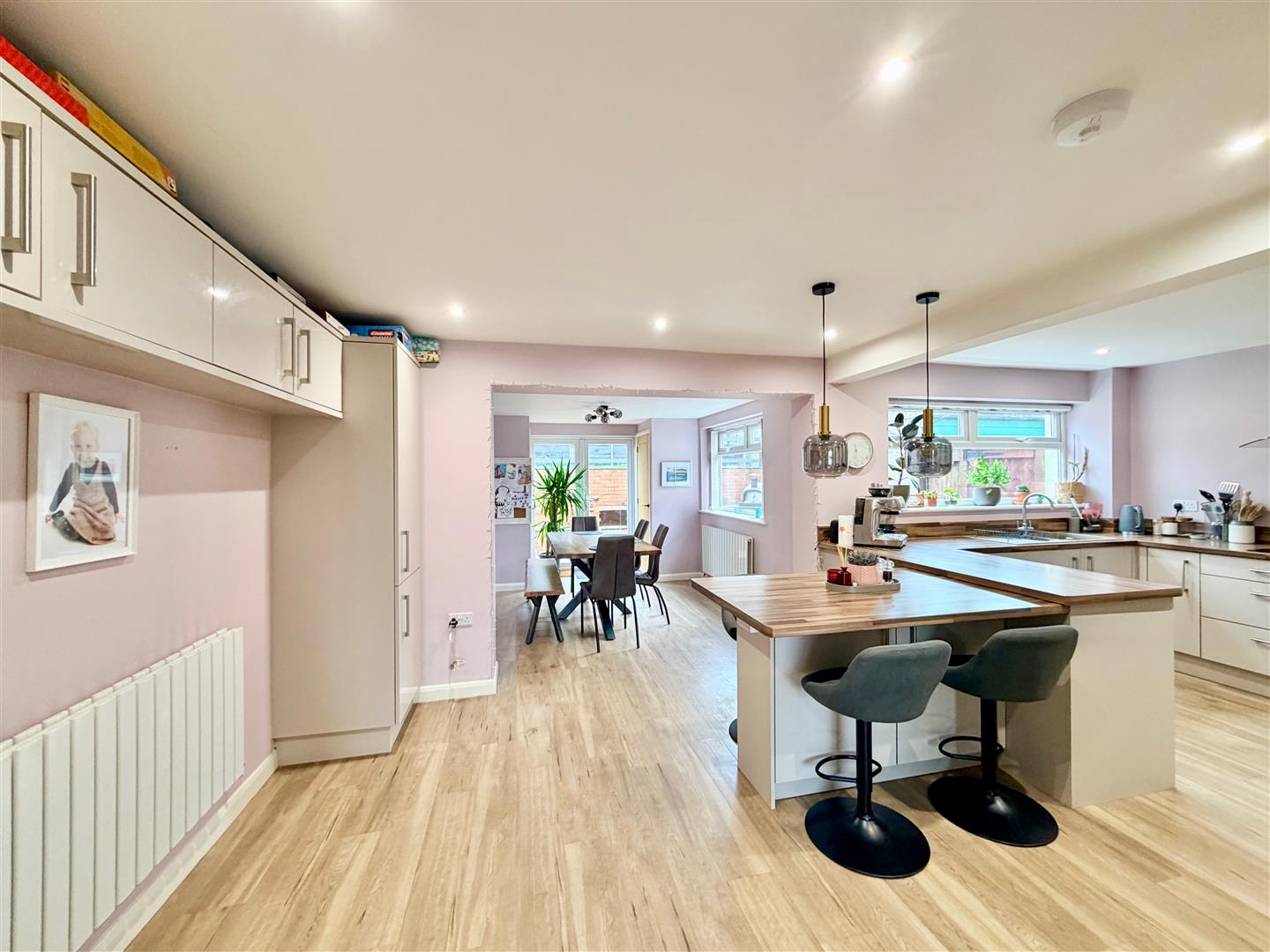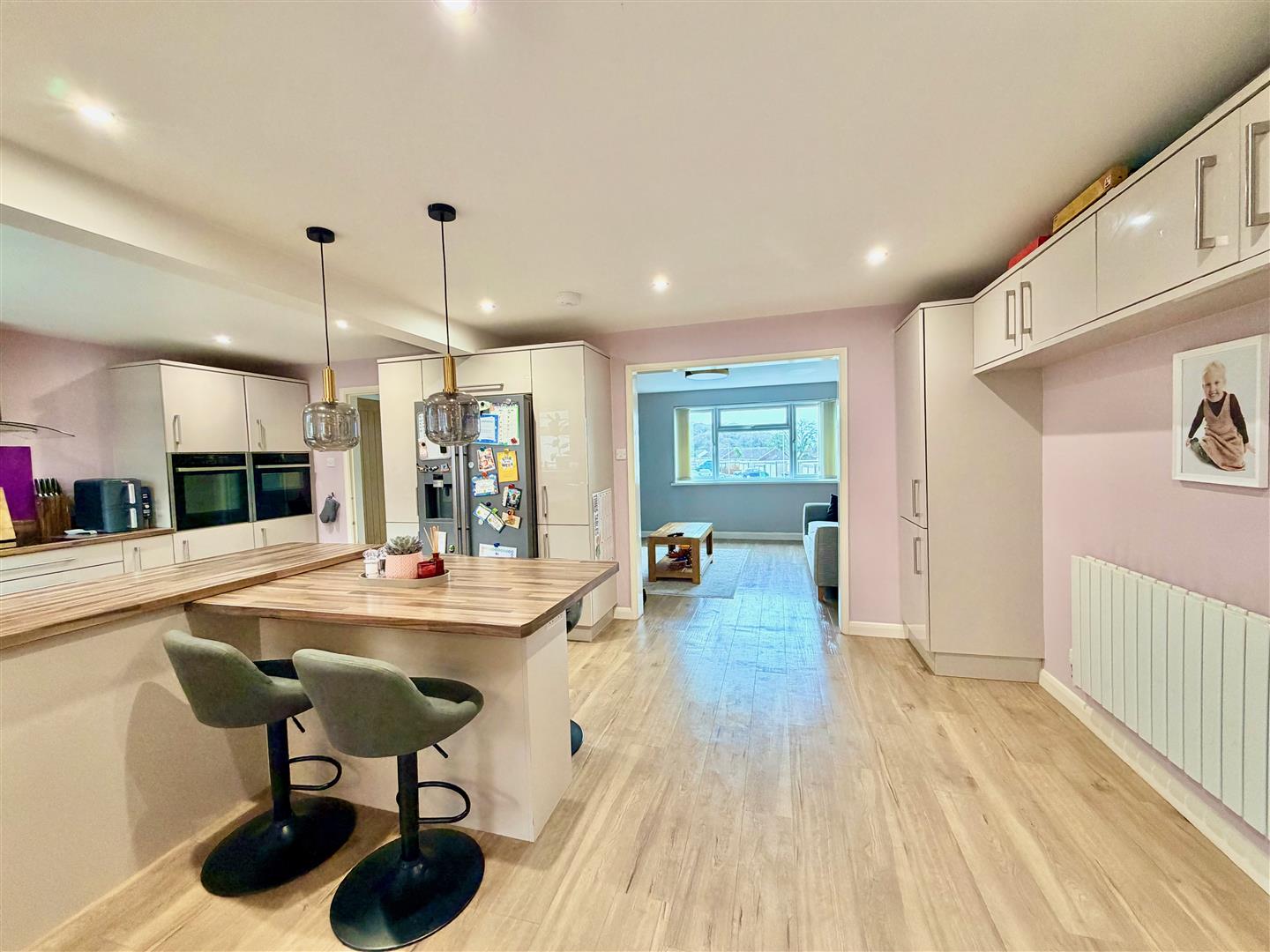 A superb open-plan 'L-shaped' room with ample space for dining table and chairs, and seating if required. Range of modern kitchen cabinets with matching fascias, work surfaces and splash-backs. Breakfast bar. Inset one-&-a-half bowl single drainer sink unit. Built-in NEFF oven plus a combination microwave oven and warming drawer. Separate inset NEFF hob with a glass splash-back and cooker hood above. Space for an American-style fridge-freezer. Space and plumbing for washing machine. Integral dishwasher. 2 built-in storage cupboards with shelving. Windows to the rear and side elevations. French doors leading to outside.