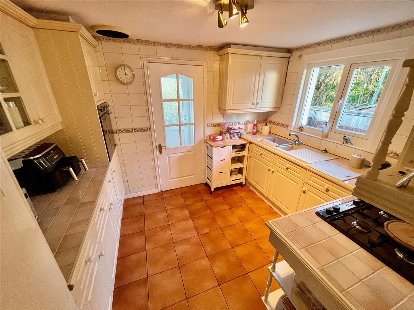 uPVC part double-glazed door to the rear garden. Two further doors into utility cupboard with window to the side. Space & plumbing for a washing machine & into a larder.