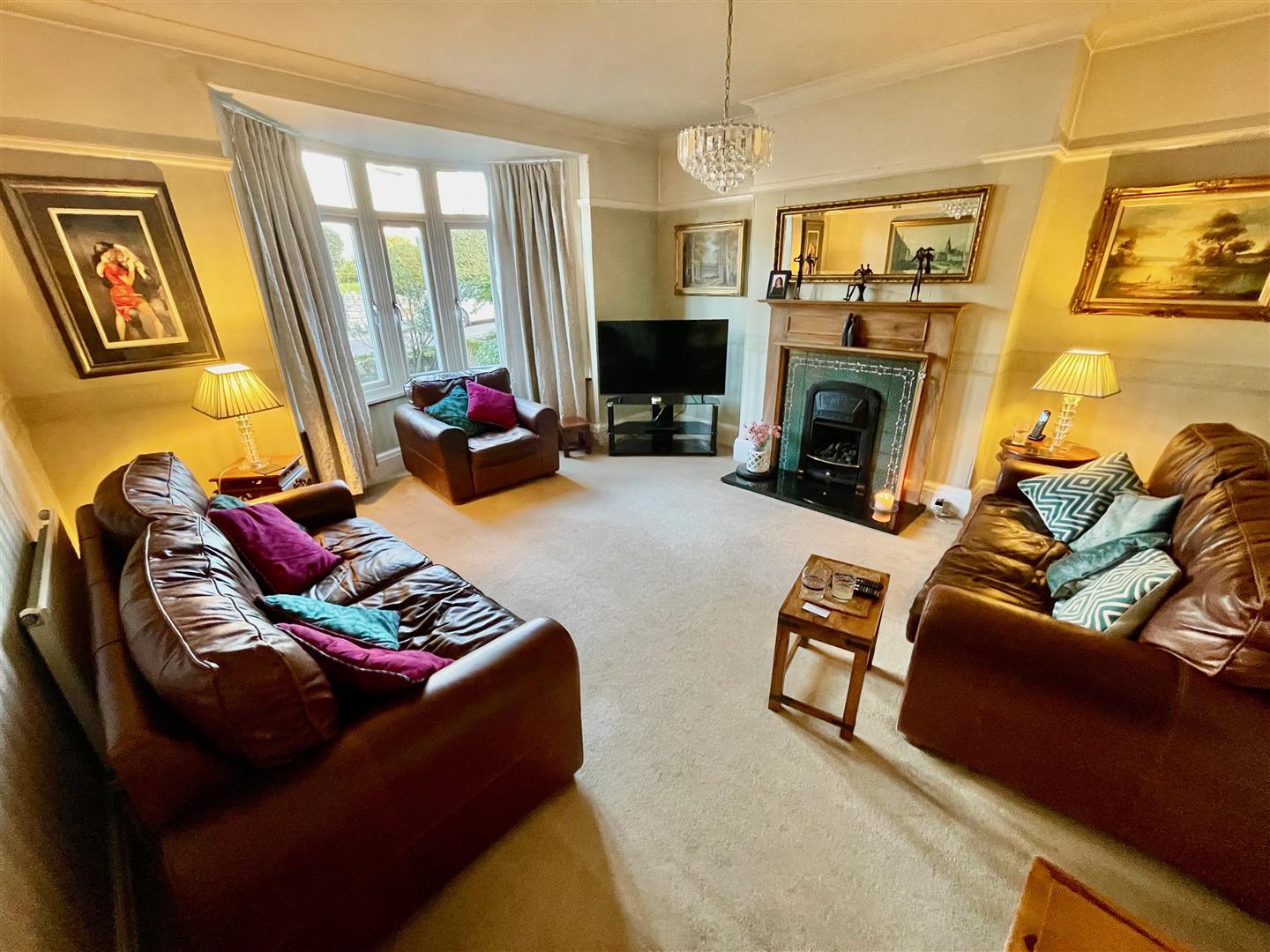 Fireplace. Twin sliding doors to;