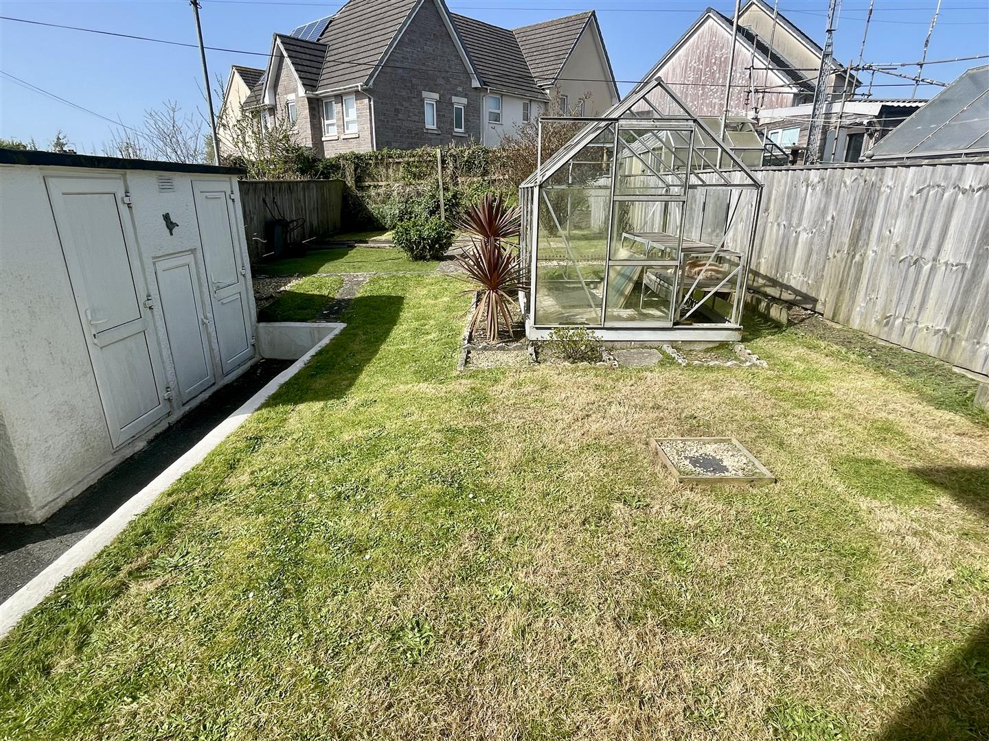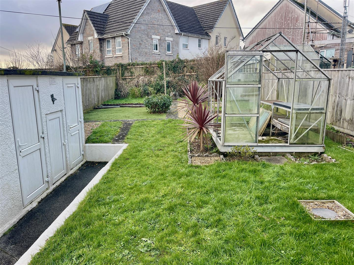 Front garden. Side area. Rear garden with 3 garden stores & greenhouse.