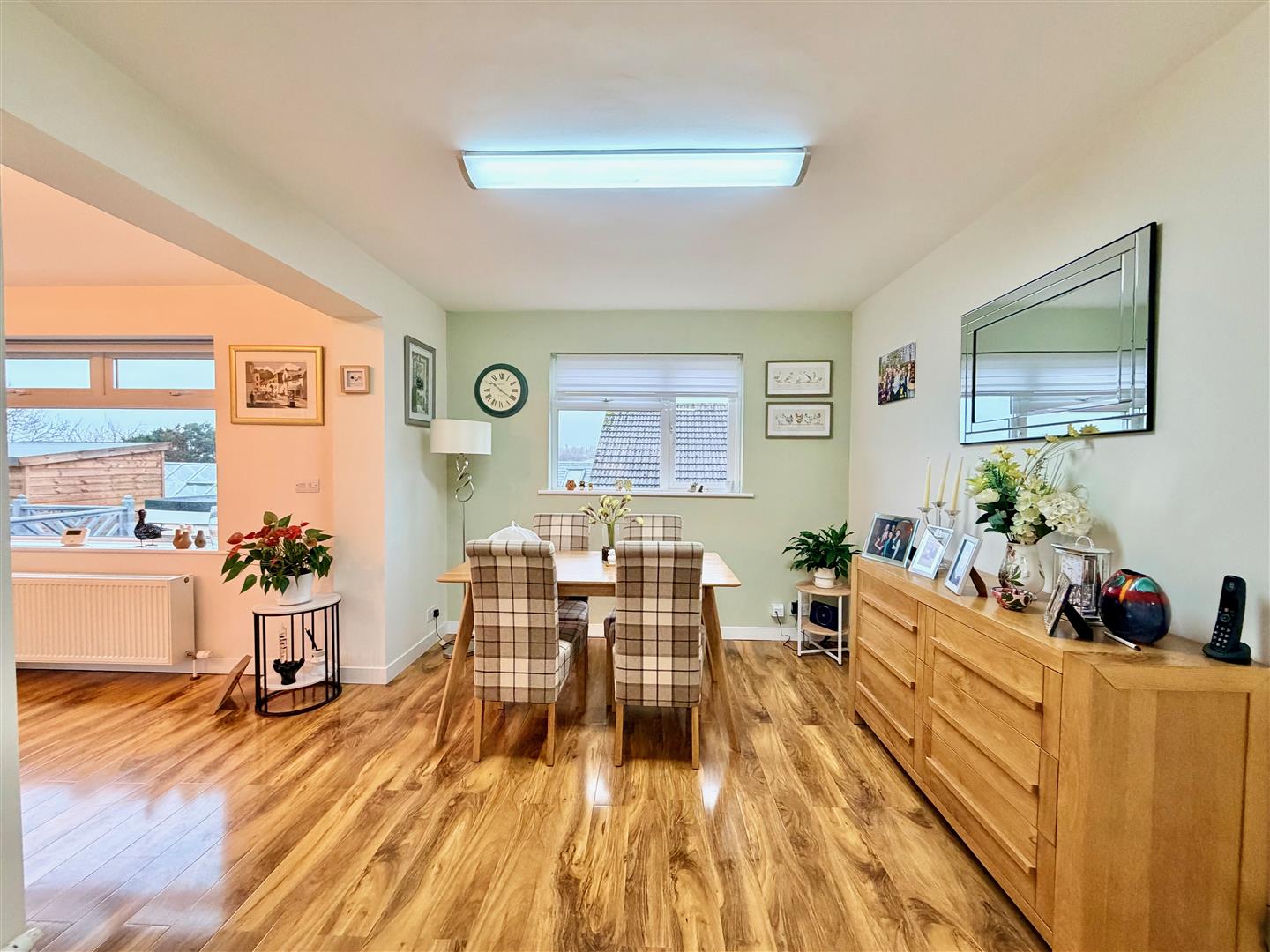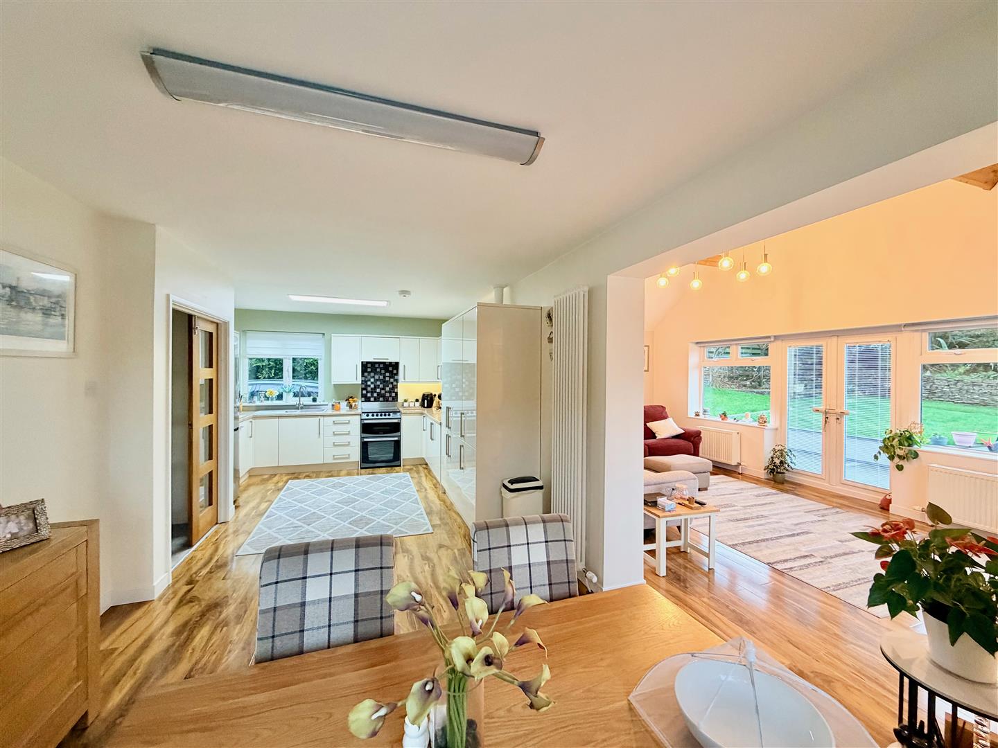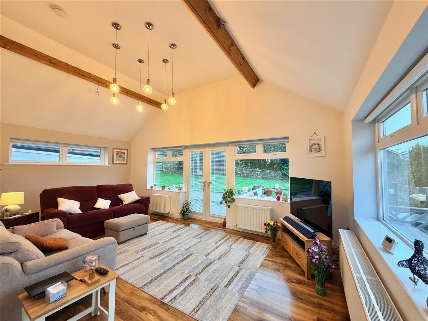 A superb room with a feature vaulted ceiling. Triple aspect with windows to both side elevations providing lovely views, and, to the rear, 2 windows and French doors overlooking and leading to the garden. Fitted flooring throughout, which continues from the kitchen/dining room.