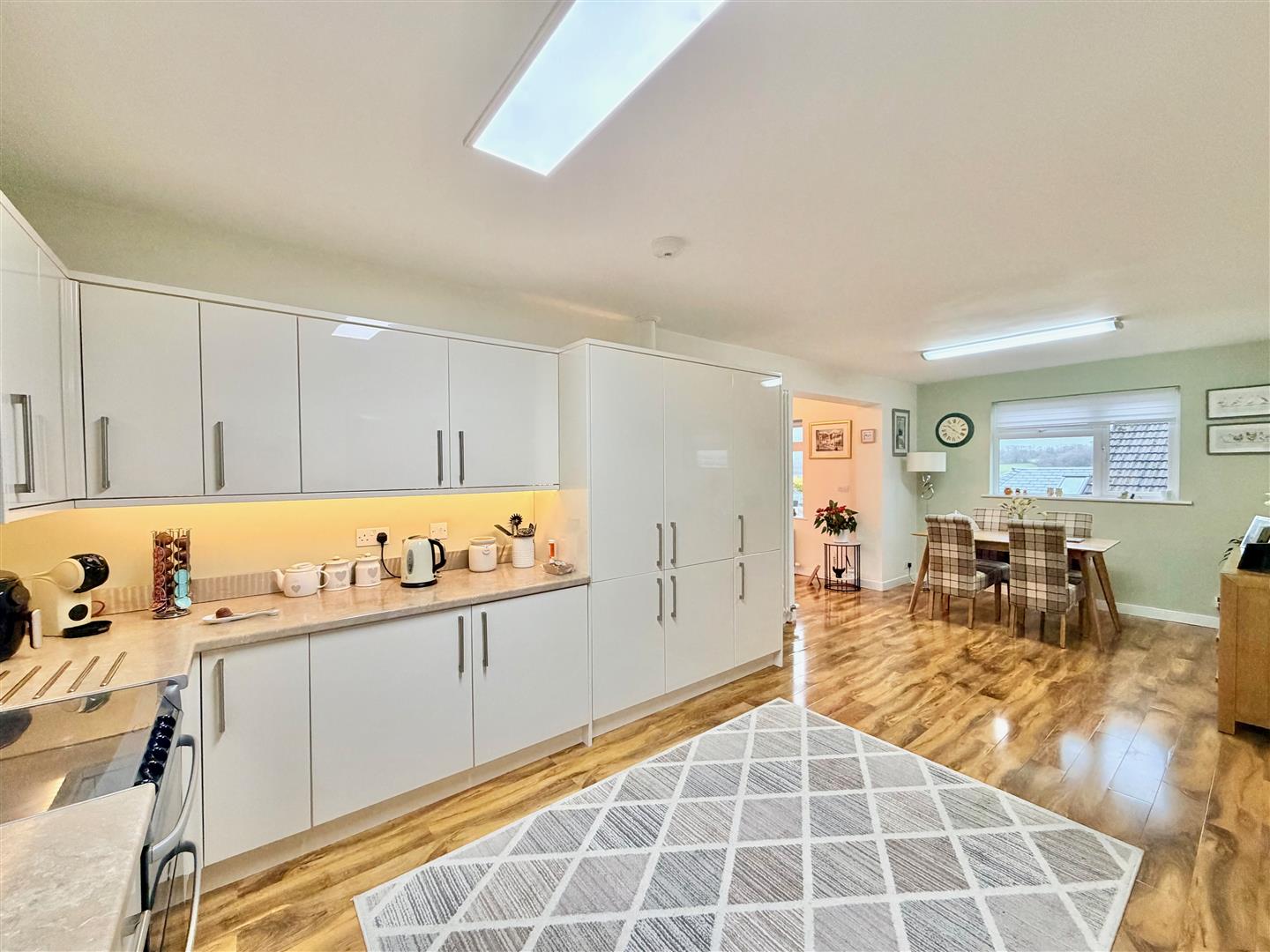 A superb open-plan dual aspect room running the full-width of the property with windows to both side elevations. Ample space for dining table and chairs. Range of modern kitchen cabinets with matching fascias, work surfaces and stainless-steel splash-backs. Inset one-&-a-half bowl single drainer sink unit. Space for free-standing fridge-freezer. Integral dishwasher. Space for free-standing cooker. Built-in microwave. Wall-mounted gas boiler concealed by a matching cabinet. Fitted flooring throughout. Concealed work-top lighting. Open-plan access through into the lounge.