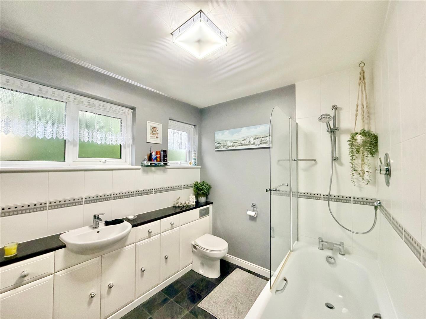 Comprising a bath with a tiled area surround and a shower system over and a range of cabinets featuring a basin with a tiled surround and wc with a concealed cistern and a push-button flush. Chrome towel rail/radiator. Wall-mounted mirror. 2 obscured windows to the side elevation.